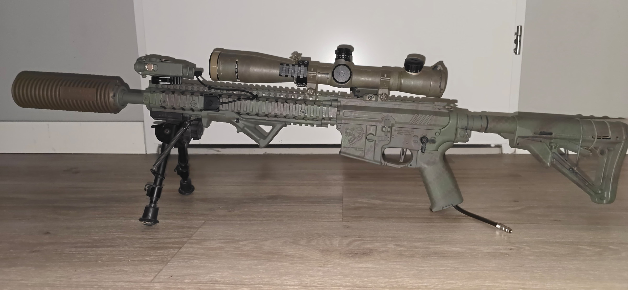 Ivm dat hij te weinig gebruikt wordt gaat mijn Mtw Billet de deur uit hij is nu opgebouwd als dmr de standaard billet rail is omgewisseld voor een DD mk18 rail waardoor het design van de replica er iets anders uitziet en niet alleennde rail maakt de buks natuurlijk anders want tja hij heeft ook een paintjob gehad om minder op te vallen op het veld natuurlijk de replica komt zoals deze op de foto staat hier een overzicht van wat er allemaal bij in zit: