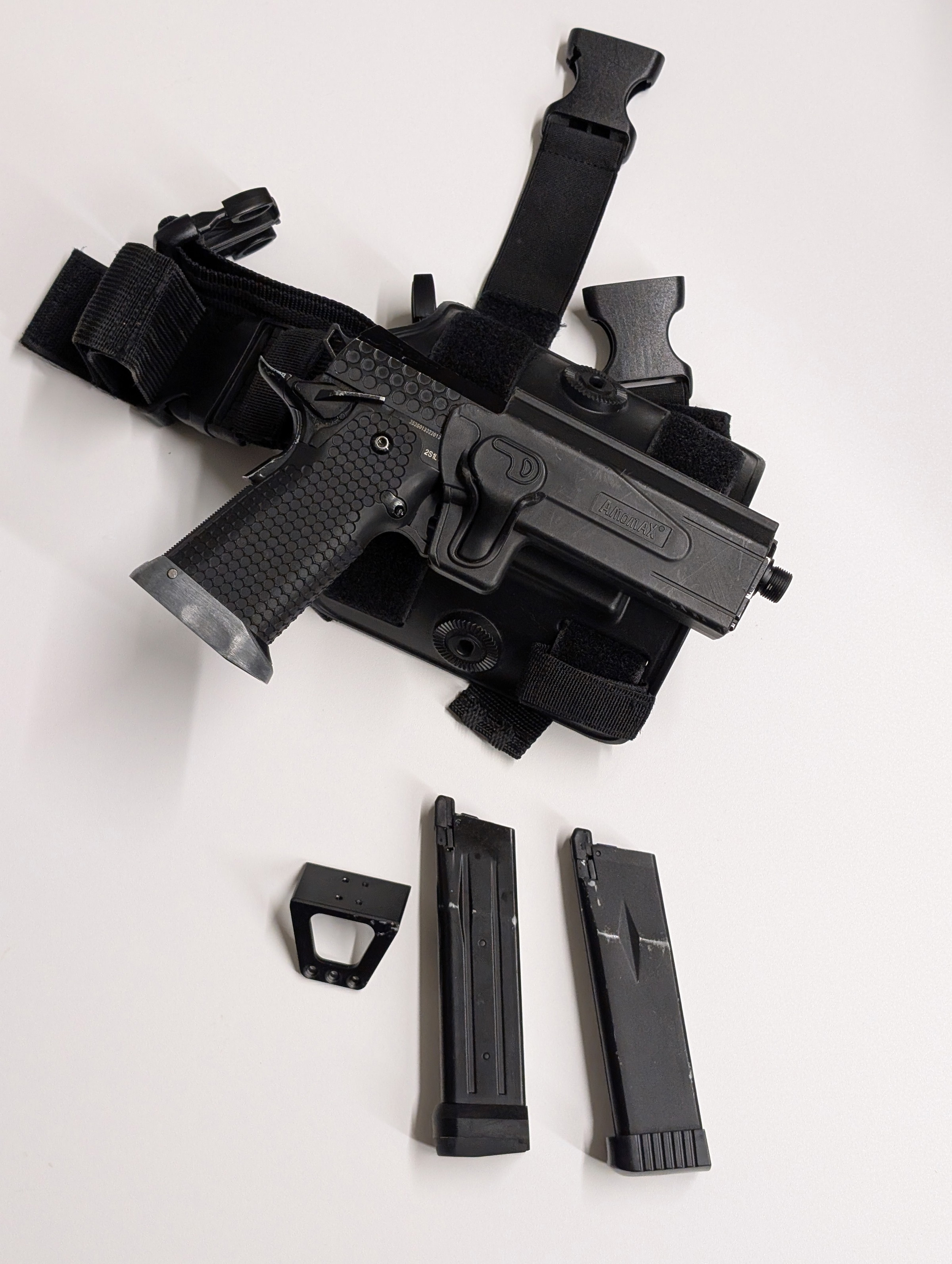 Novritsch SSP2, 2 magazines (non-leaking), leg holster, tracer adapter, magwell, red dot plate (lost screws)