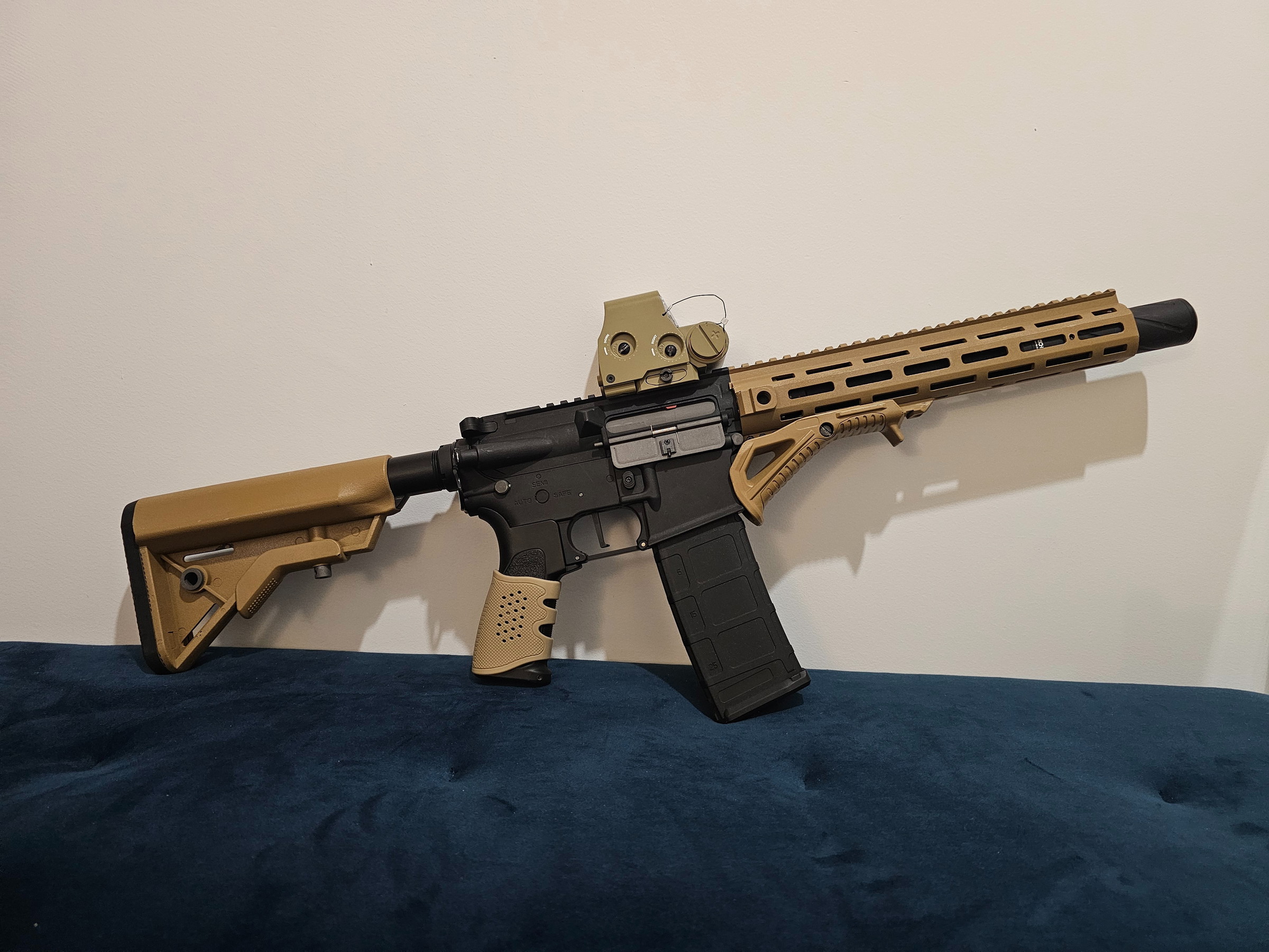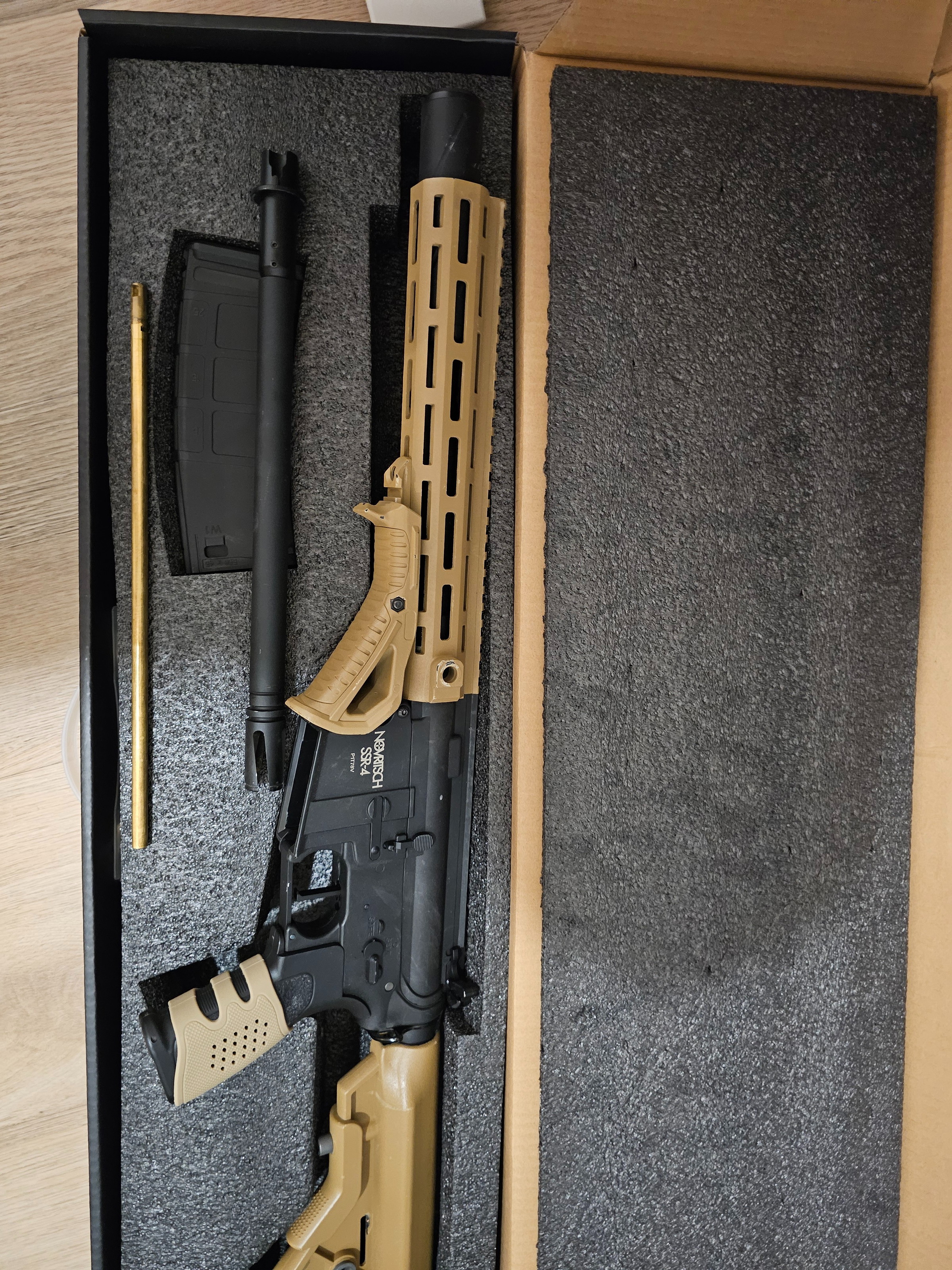 I am the 1st owner and the only reason I am selling it because I fall in love with an other replica and I don't need two. This is the polymer version and I painted the handguard and the stock by myself, therefore you can see some minor scratches on the painting. I changed the bucking to maple leaf super macron and an omega Nub, everything else is still original. I used the replica about 5-6 games, with the new bucking only 1 game. The replica is very accurate and it has a good range and always feeding the BB's, never missing a single one. It comes with 1 mid cap magazine, EO Tech red dot, short inner barrel + mock suppressor (I give you the long barrel too of course) and there is a tracer placed in the suppressor so its ready to use tracer BB-s. If you want to come to try it personally we can visit the local airsoft field's shooting range in Almere. You will not be disappointed!