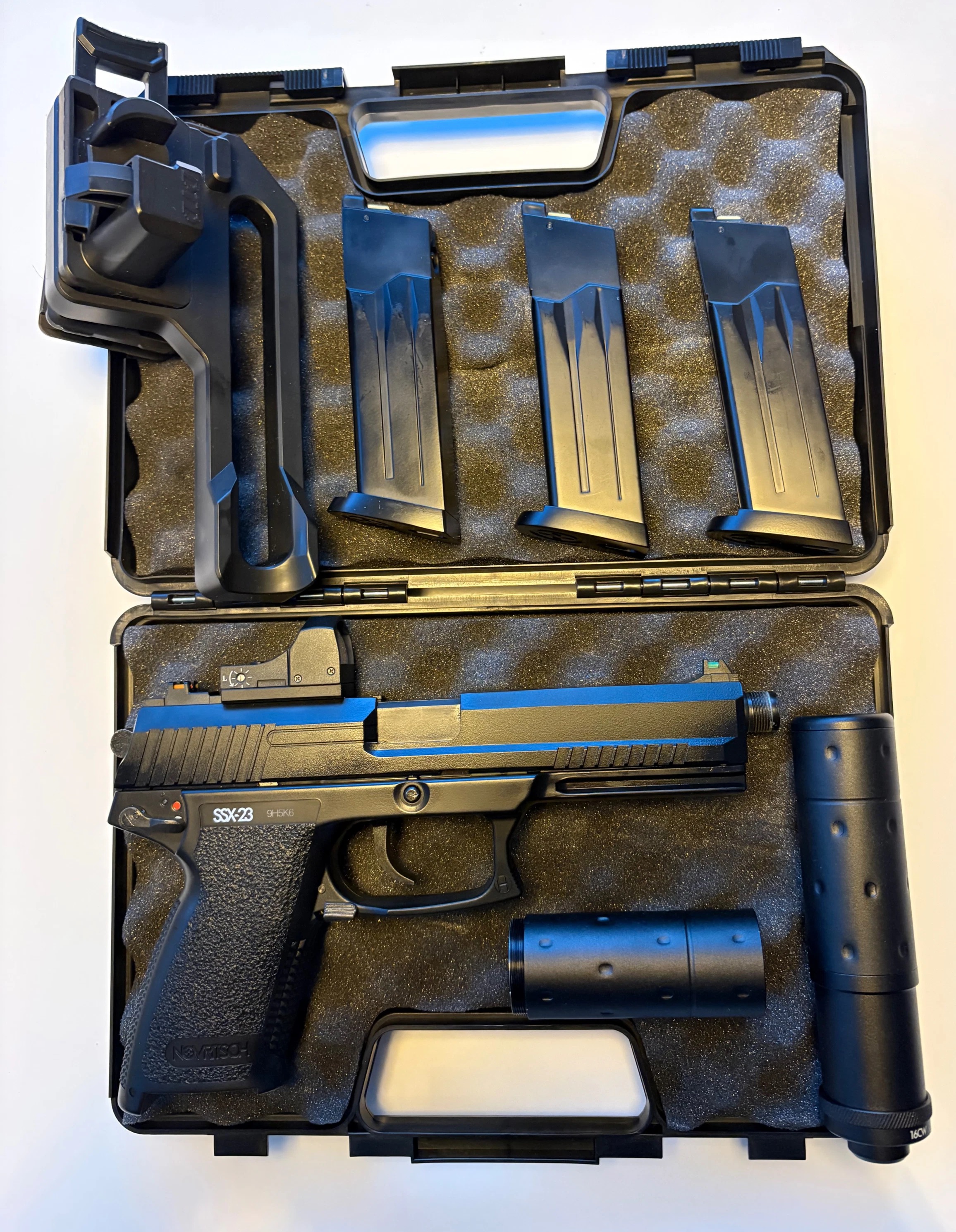 Gloednieuwe Novritsch ssx23 inclusief 2 extra magazijnen dus 3 in totaal, nieuwe red dot montage plaat, nieuwe red dot, nieuwe modulaire demper en een nieuw holster met combat belt clip.