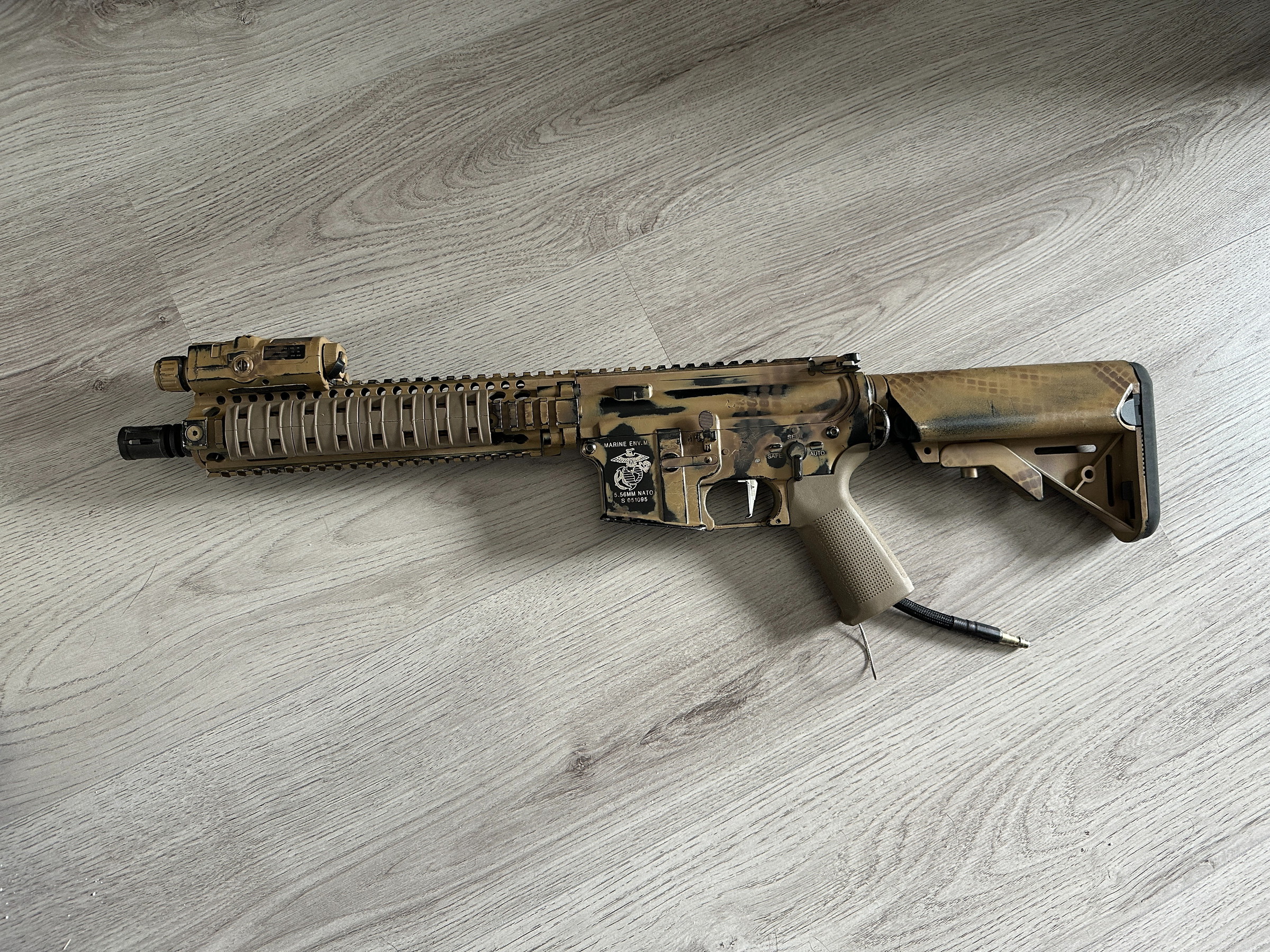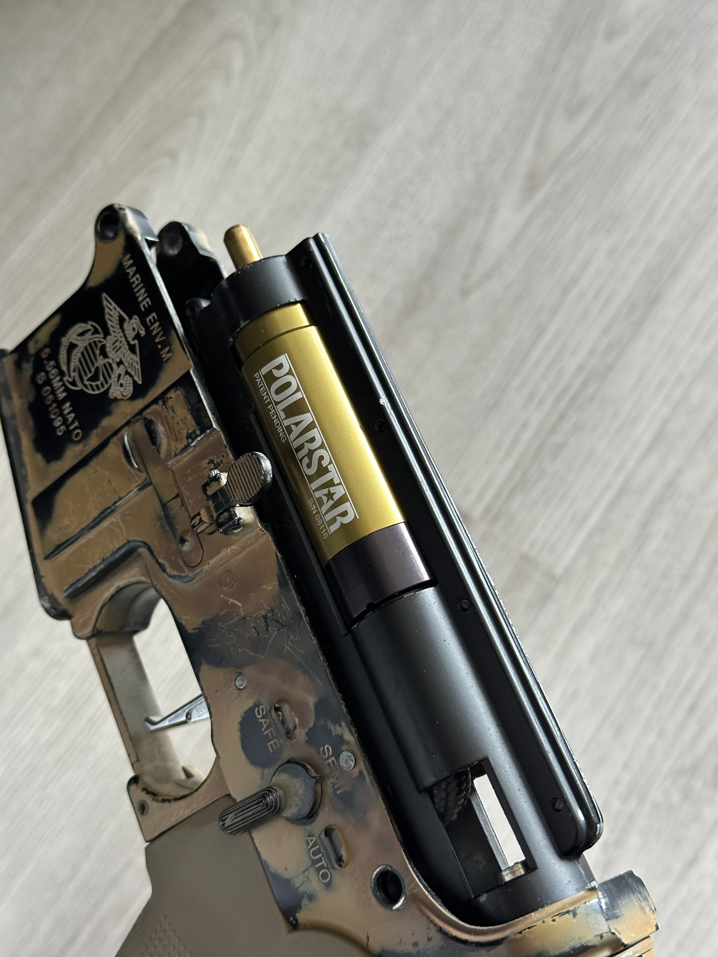 Project replica omgebouwd om gebruik te kunnen maken van de Polarstar Kythera. De Kythera heeft weinig gebruik gezien, ik schat max 10 skirms. Gebruikt een US-style nipple voor de HPA slang. De trigger van de replica is vervangen, safe werkt daardoor minder goed.