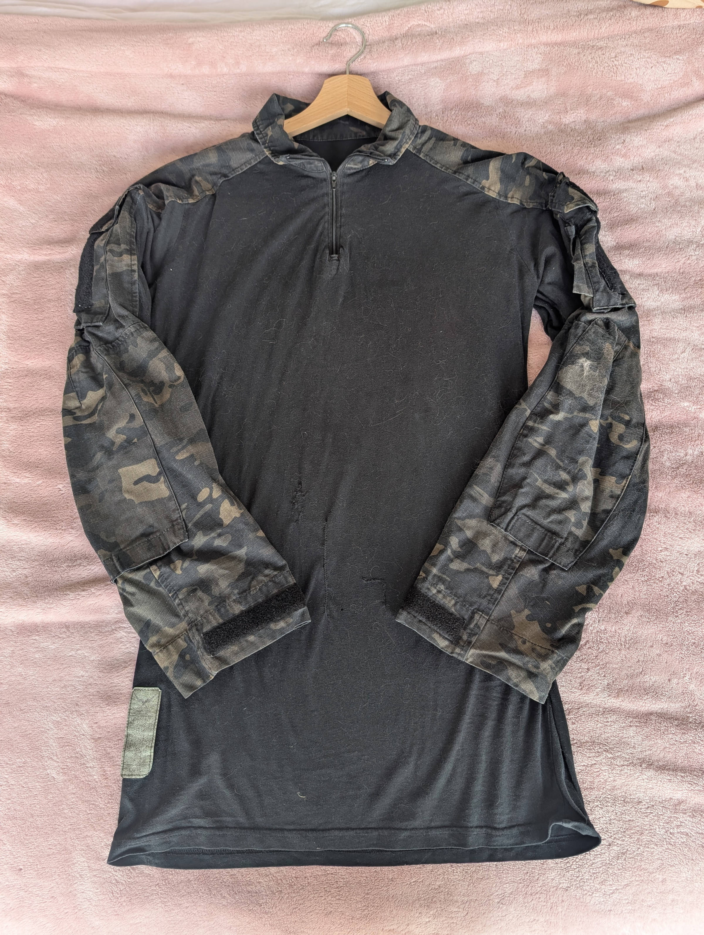 Selling Qilo pants, size M, and an FFI t-shirt, size L, MC Black. The t-shirt has three small holes, machine-sewn. Still in good condition and can be worn for a long time. Official MP7 patch.