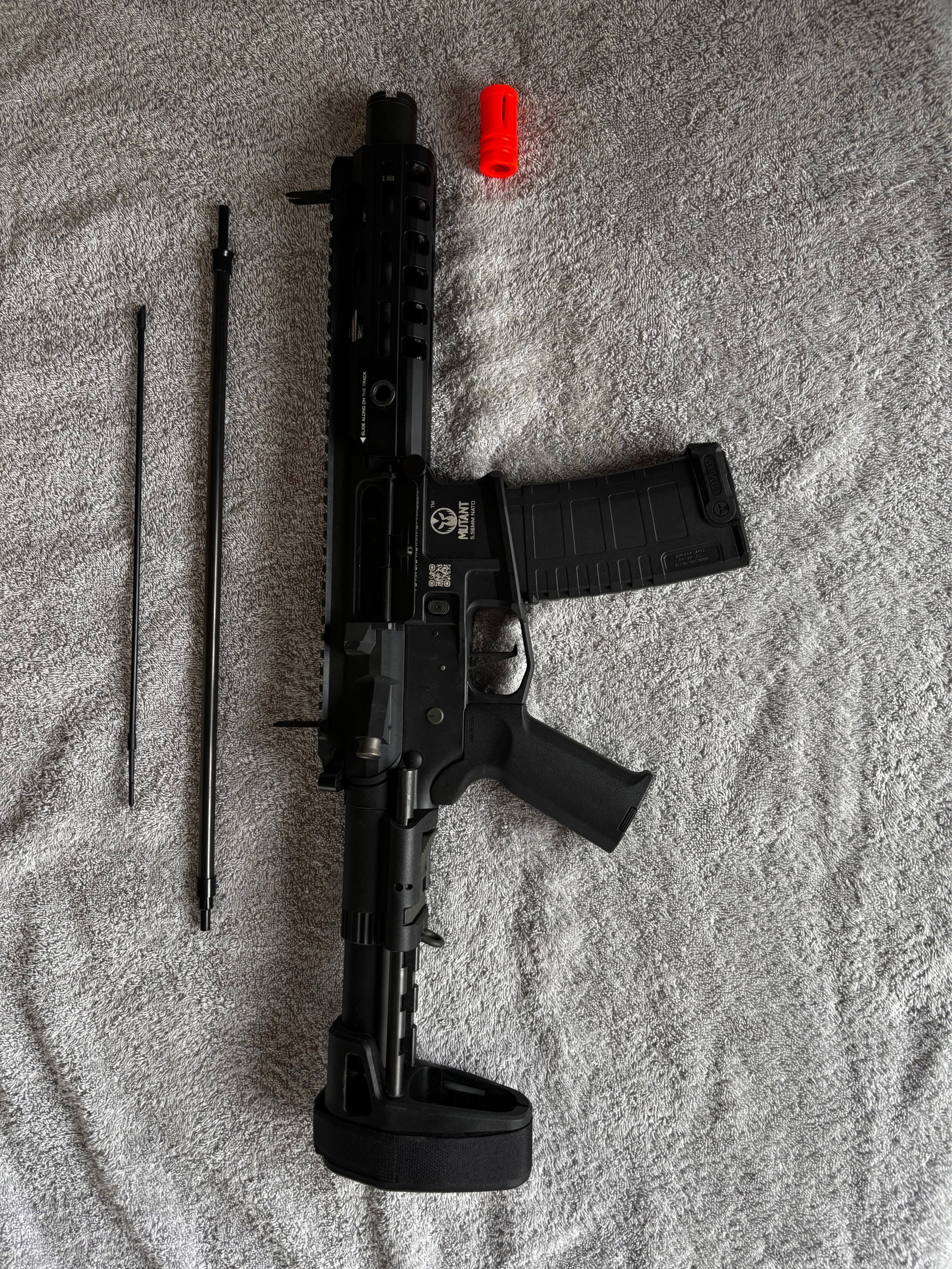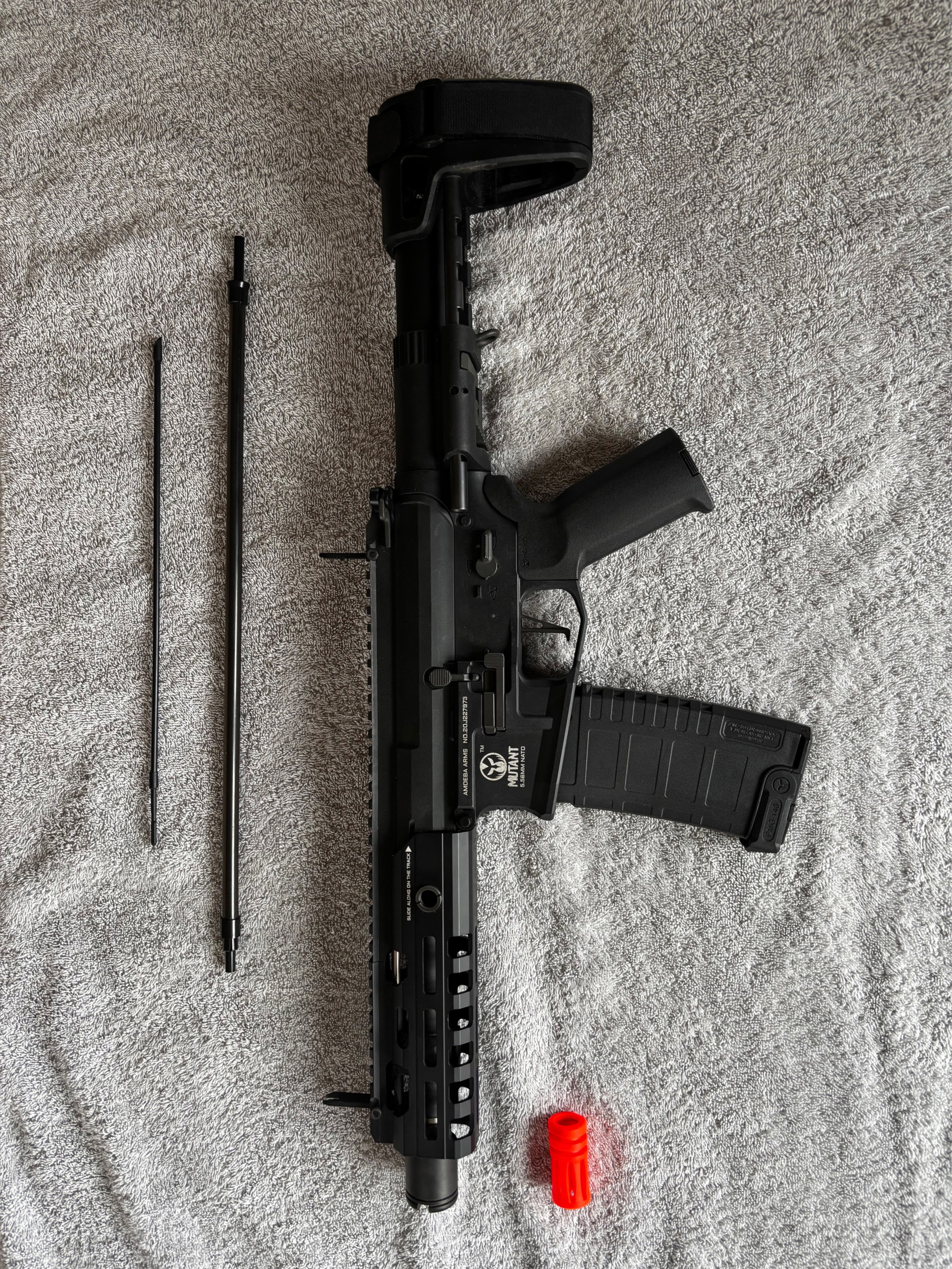 Cette annonce inclut un chargeur mid-cap de 140 billes, un muzzle de couleur orange et un autre noir métallique (présent sur les photos)