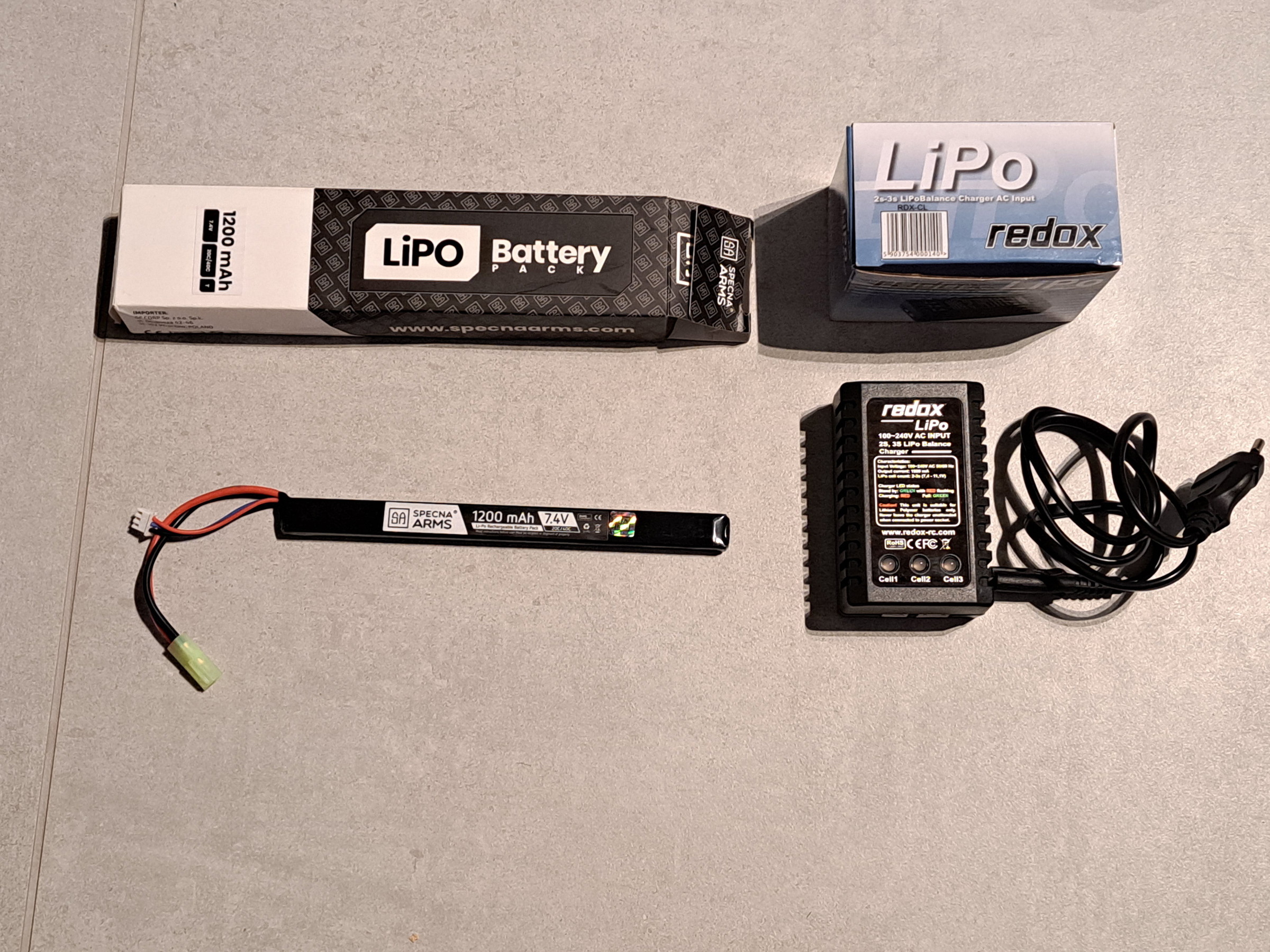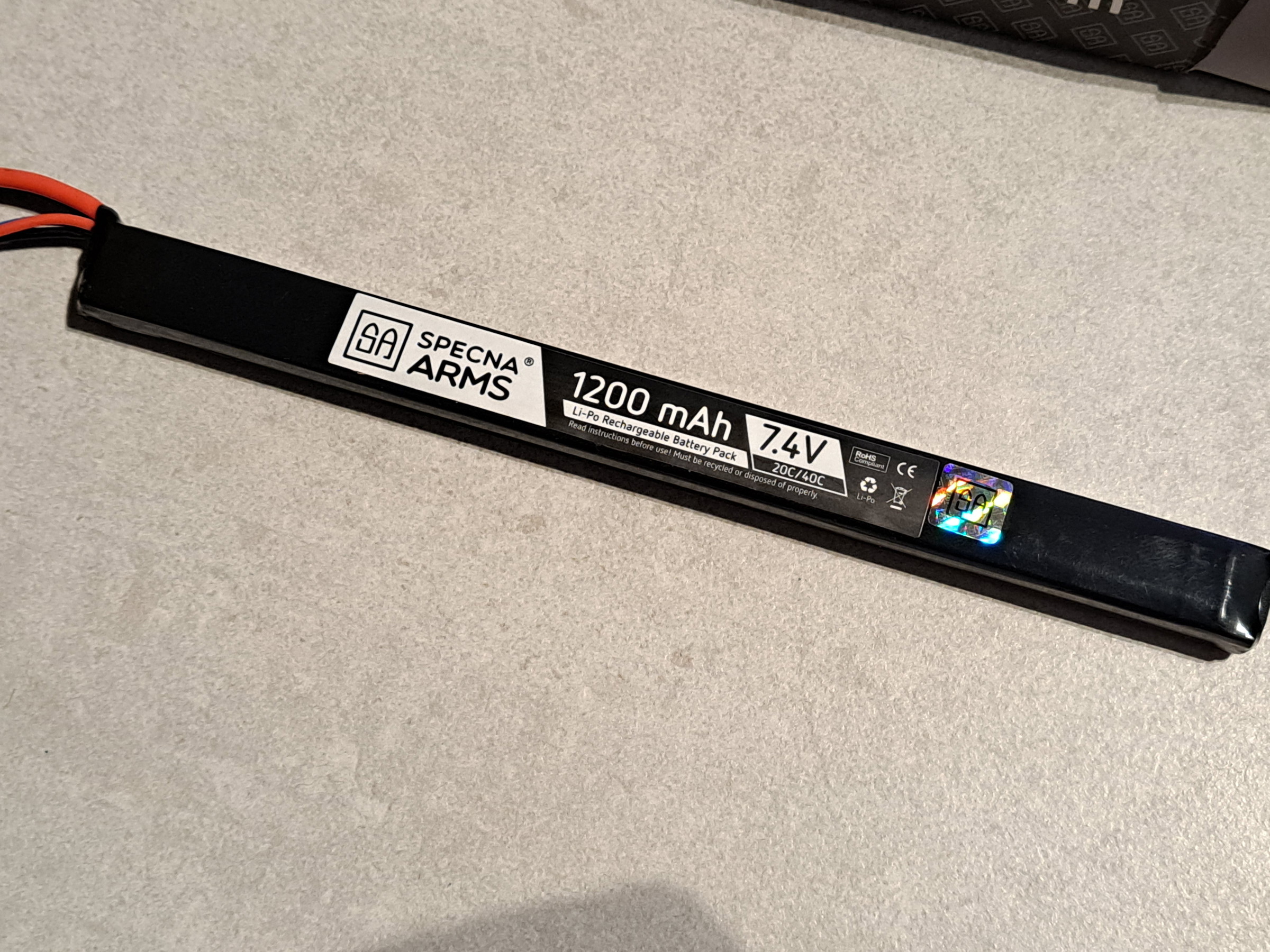 Specna Arms 7.4V 1200mAh 20C/40C lipo batterij met mini Tamya aansluiting. Past onder de dustcover voor alle soorten ak's (ak47, ak74, 104, 105 enz).