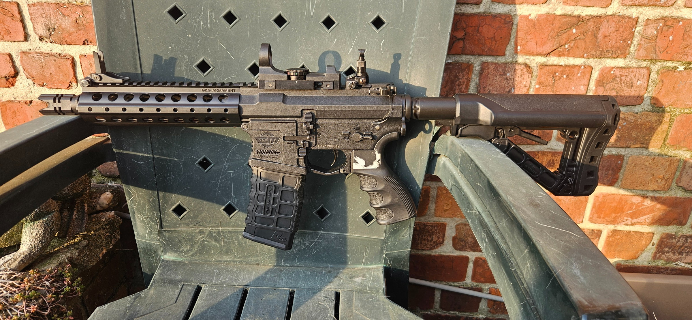 - g&g m4 short type aeg. Komt met een batterij en 1 high cap magazijn en een kleine red dot. Ook nog een cheap t1 red dotje beschikbaar eventueel