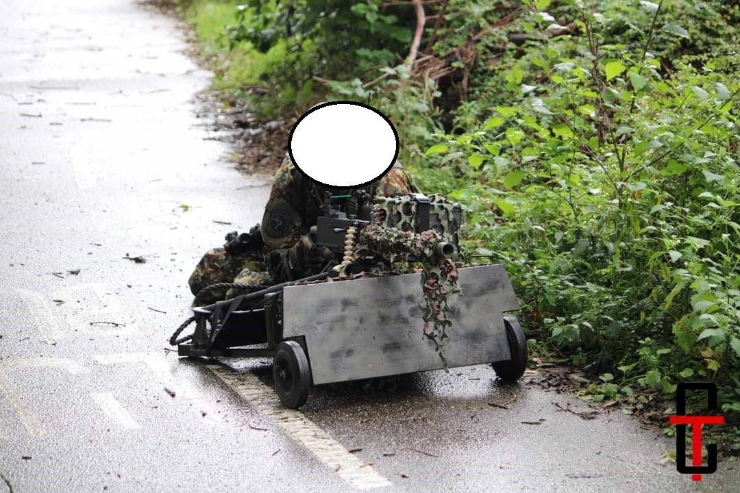 Tevens heb ik er een klein karretje bij gemaakt voor makkelijker transport op/naar de velden. Op 1 foto is hij in gebruik te zien. Kan natuurlijk ook gewoon los gebruiken. Op de foto's niet te zien, maar de munitie kist kan op een schapje geplaatst worden die aan de replica zit, Eventueel makkelijk te verwijderen. Daarnaast is de pantserplaat makkelijk los te schuiven. Deze is lichtgewicht maar sterk genoeg om een veld dag te overleven. De plaat afhankelijk van de veld regels betreffende weapon hit heeft mij al zeker honderden keren gered. (mits tactisch geplaatst)