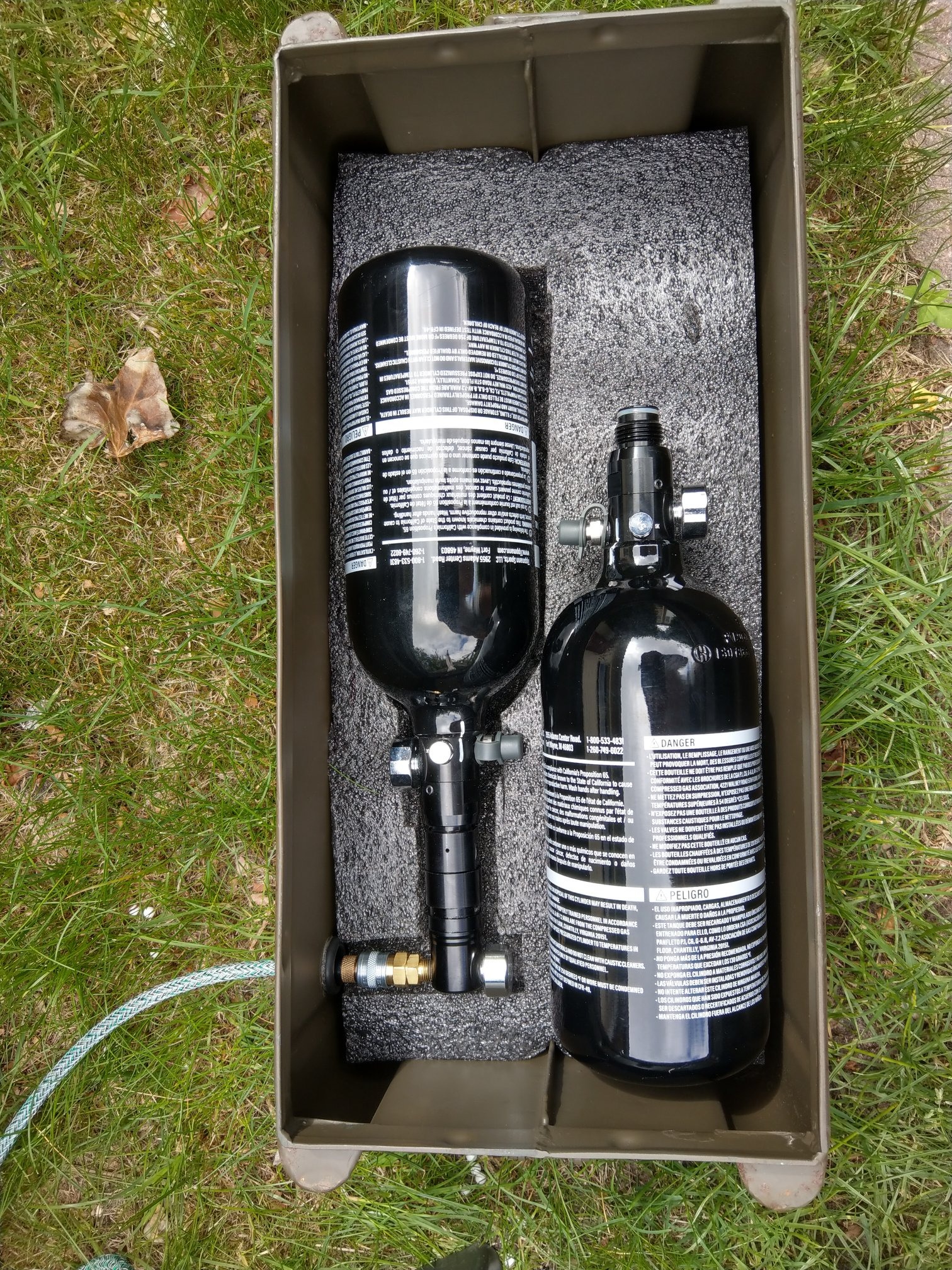 In de munitie kist is ruimte om 2 flessen te plaatsen. Indien gewenst kan er 1 fles inbegrepen worden bij de prijs. (en/of regulator)
