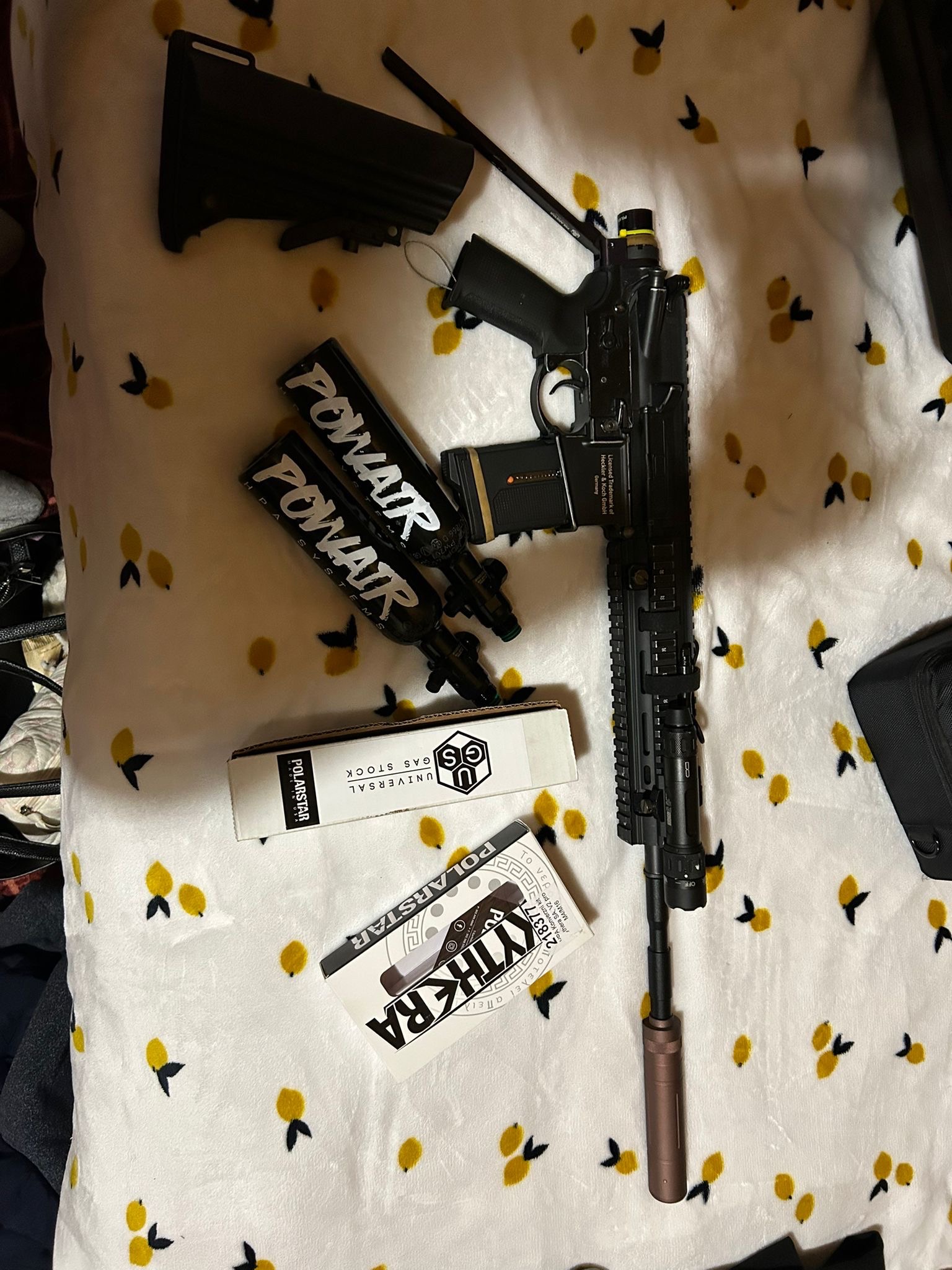 The gun is equipped with a PolarStar UGS stock. Internally, it has a PolarStar Kythera, a Maxx hop-up chamber, a Maple Leaf bucking, and a Maple Leaf inner barrel.