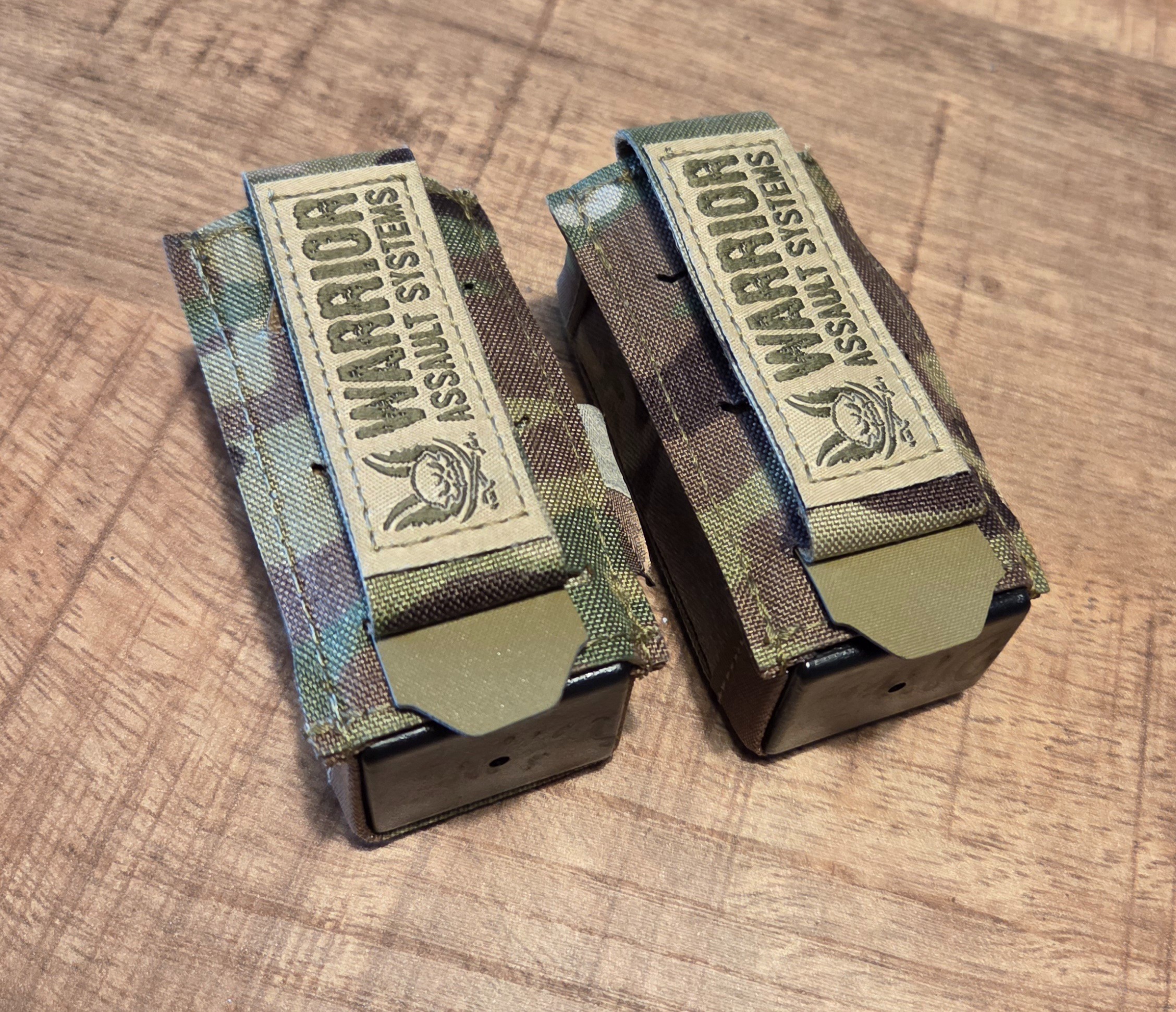 2x Warrior Assault Single Snap Mag Pouch 9mm Short in de kleur Multicam. De pouches zijn alleen gebruikt om te testen en niet in het veld gebruikt.