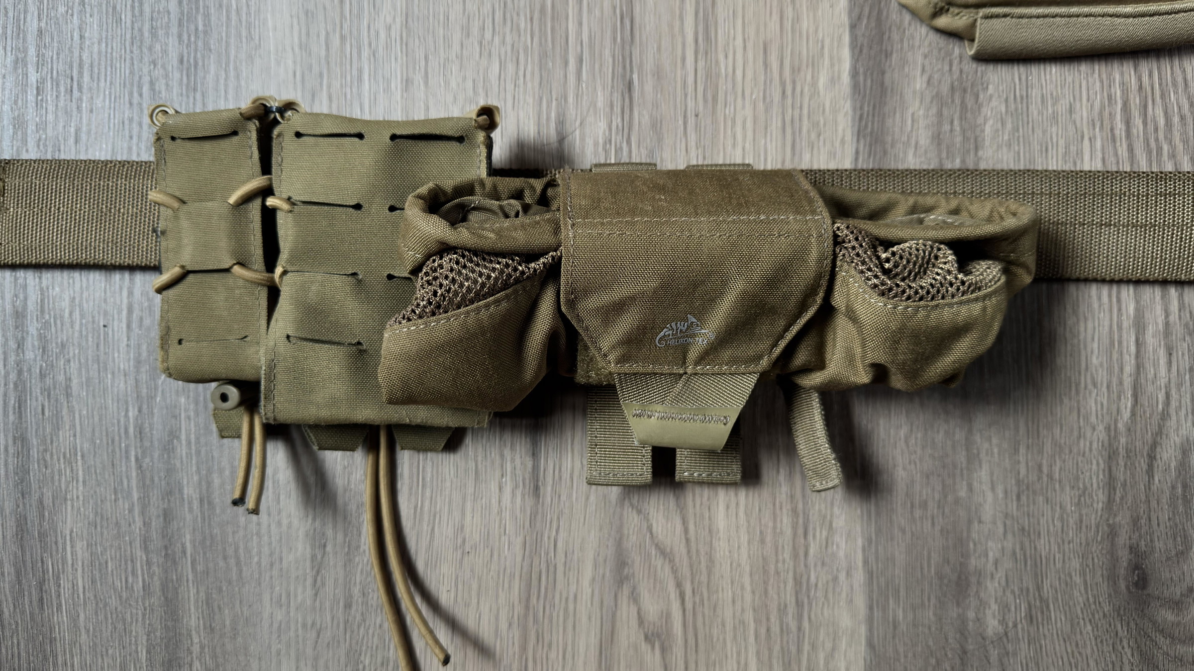 Hier zit een originele drop down pouch op, en hydration system, radio pouch en Utility pouch. De Riem cobra fast lock sluiting, templar gear mag pouch M4, mag pouch 9mm, helicon dump pouch, en Warrior Assault Systems Multicam holster.