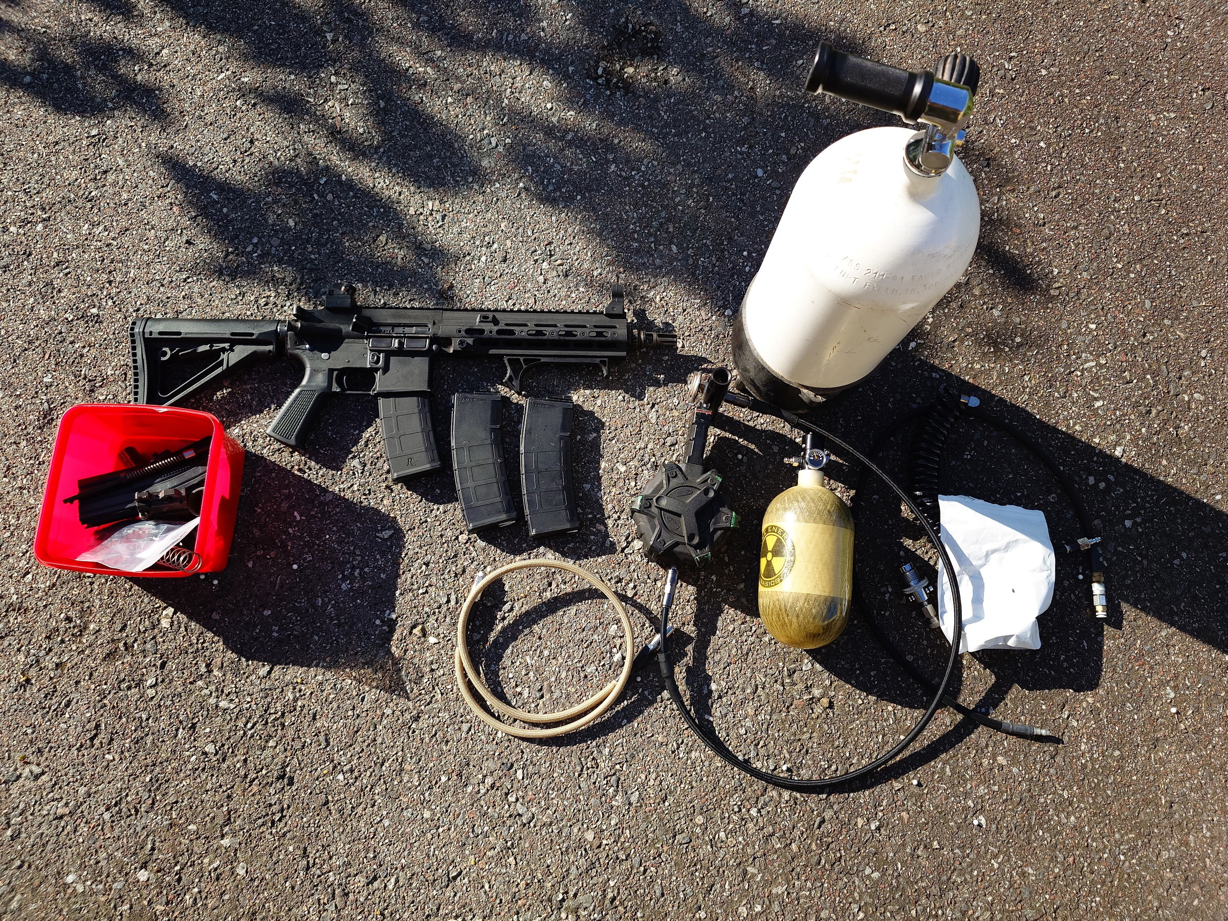 4 "P-mag" where all are tight and work perfectly. New WE nozzle, 2 used in reserve. The gun has been painted by the previous owner and the screw at the back that holds the triggerbox has had its head drilled out, I lack the tools/knowledge to get the brass screw out safely but the gun works as it should as the fire selector and the "hammer pin" hold the box in place. HPA setup connections. Various hoses and loose parts are included. Pressure gauge has done its job on the regulator. The tanks wont be included in this deal. The drum mag feeds as it should. Looks at the pictures for clarification about whats included and offered.