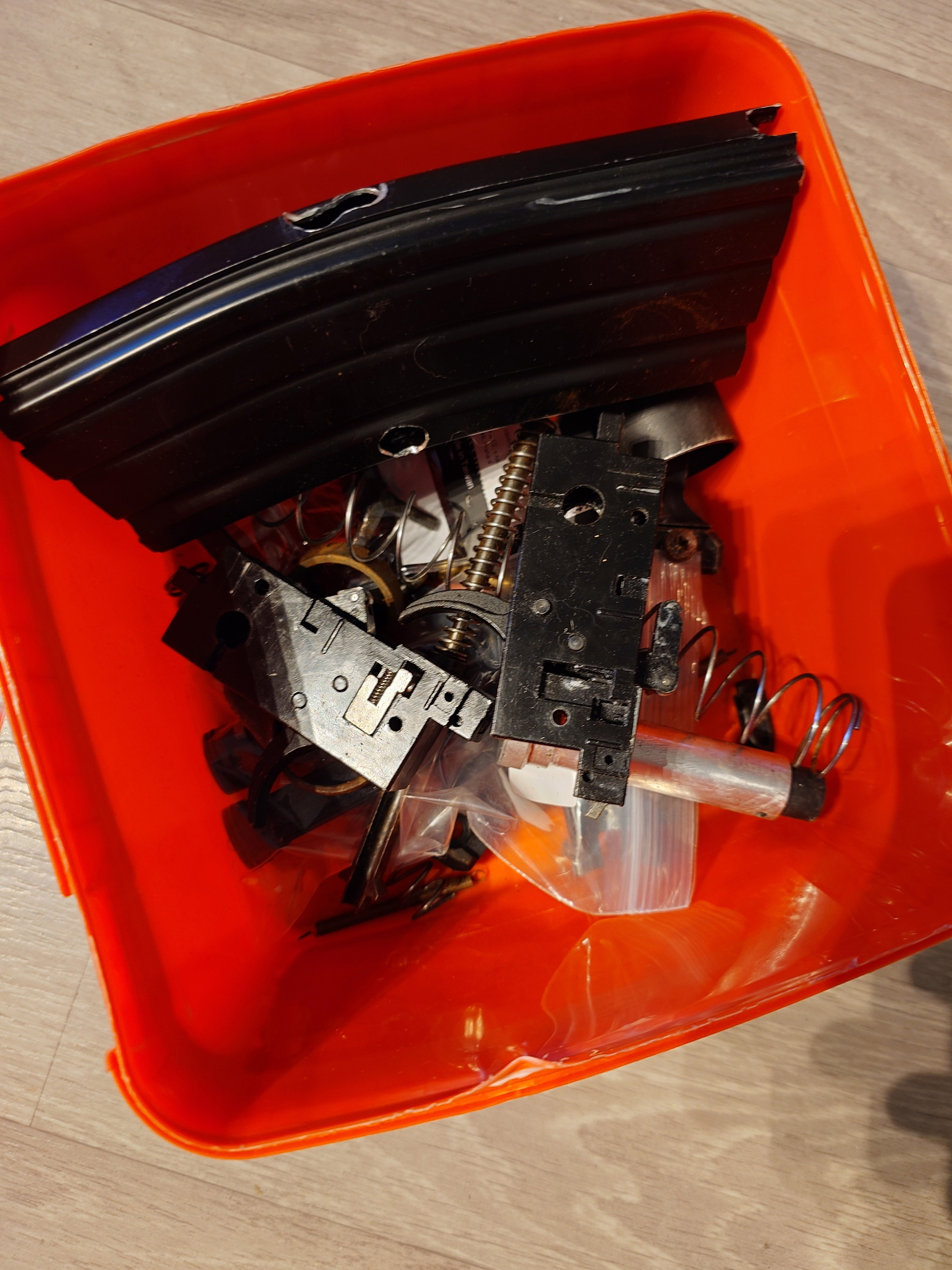 4 "P-mag" where all are gastight and work perfectly. New WE nozzle, 2 used in reserve. The gun has been painted by the previous owner and the screw at the back that holds the triggerbox has had its head drilled out, I lack the tools/knowledge to get the brass screw out safely but the gun works as it should as the fire selector and the "hammer pin" hold the box in place.