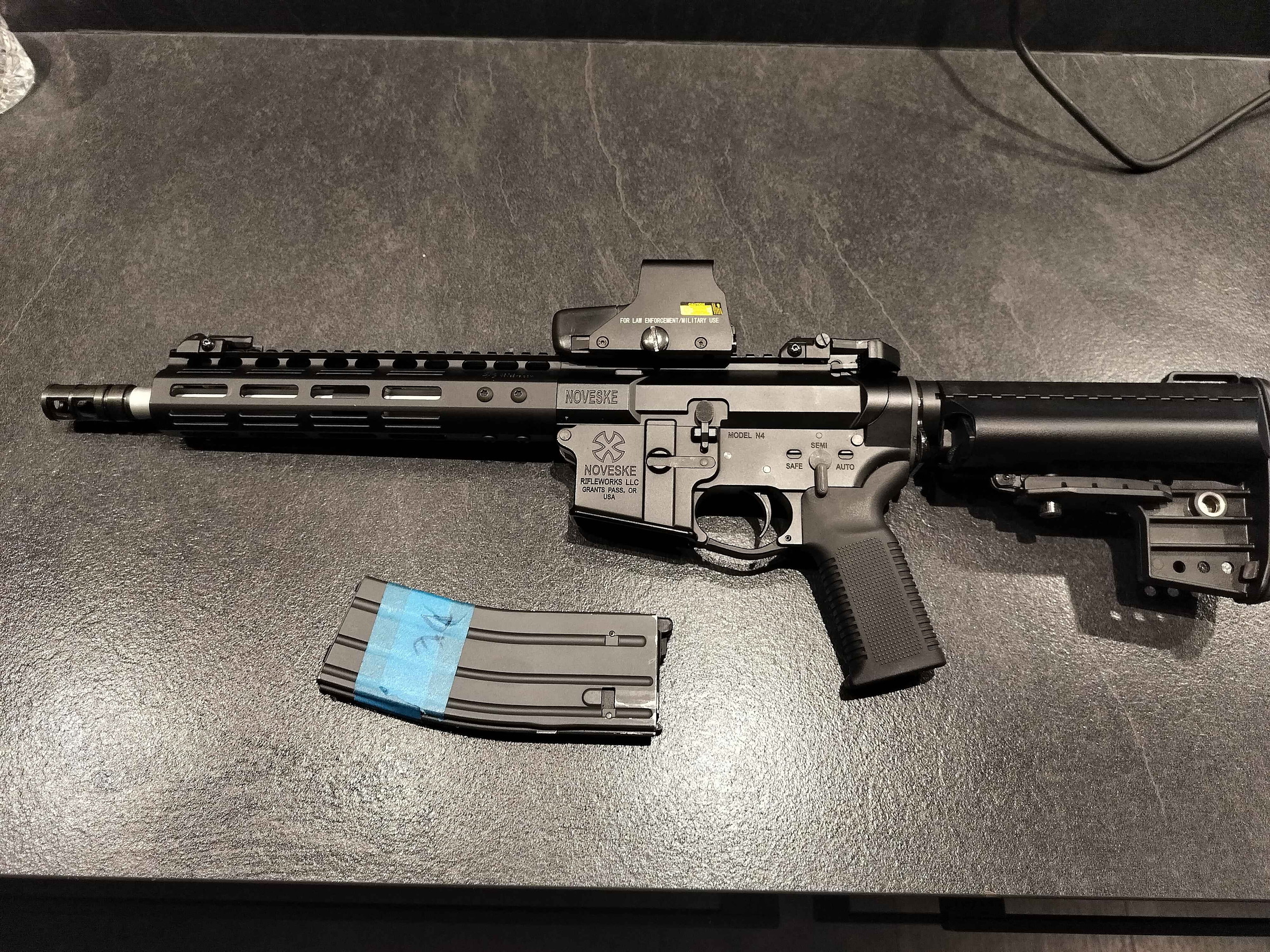 Replica komt met een DE stanag magazijn en de red dot op de foto.