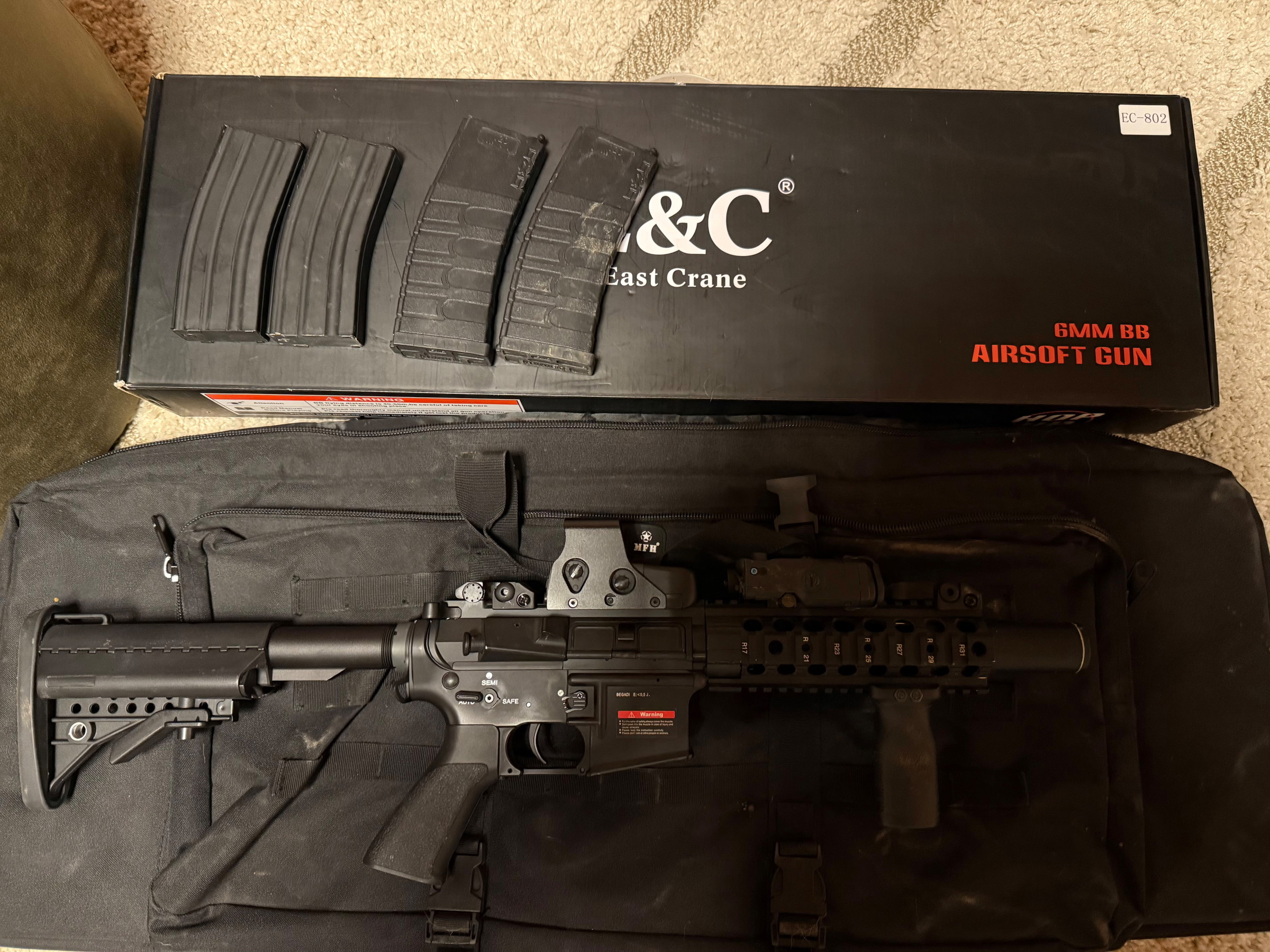 Lieferumfang: Waffe + montiertes Zubehör , 4 Magazine, Tasche.