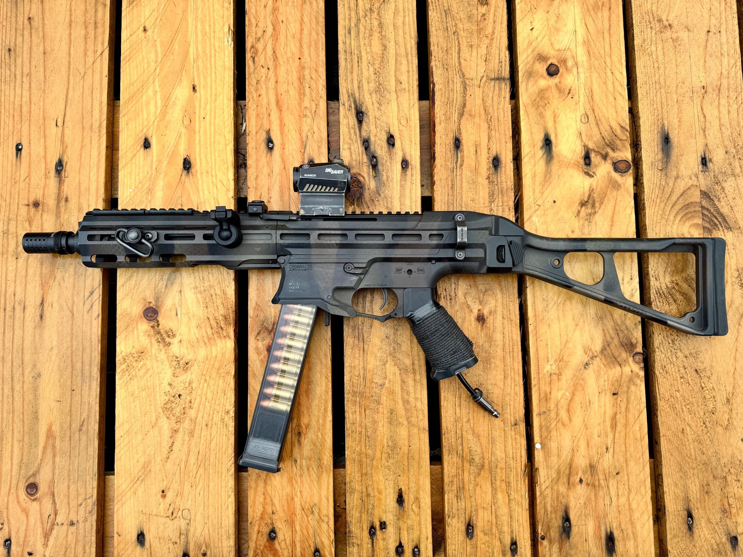 Ter overname aangeboden een zo goed als nieuwe G&G PCC45 met Ares HPA engine.