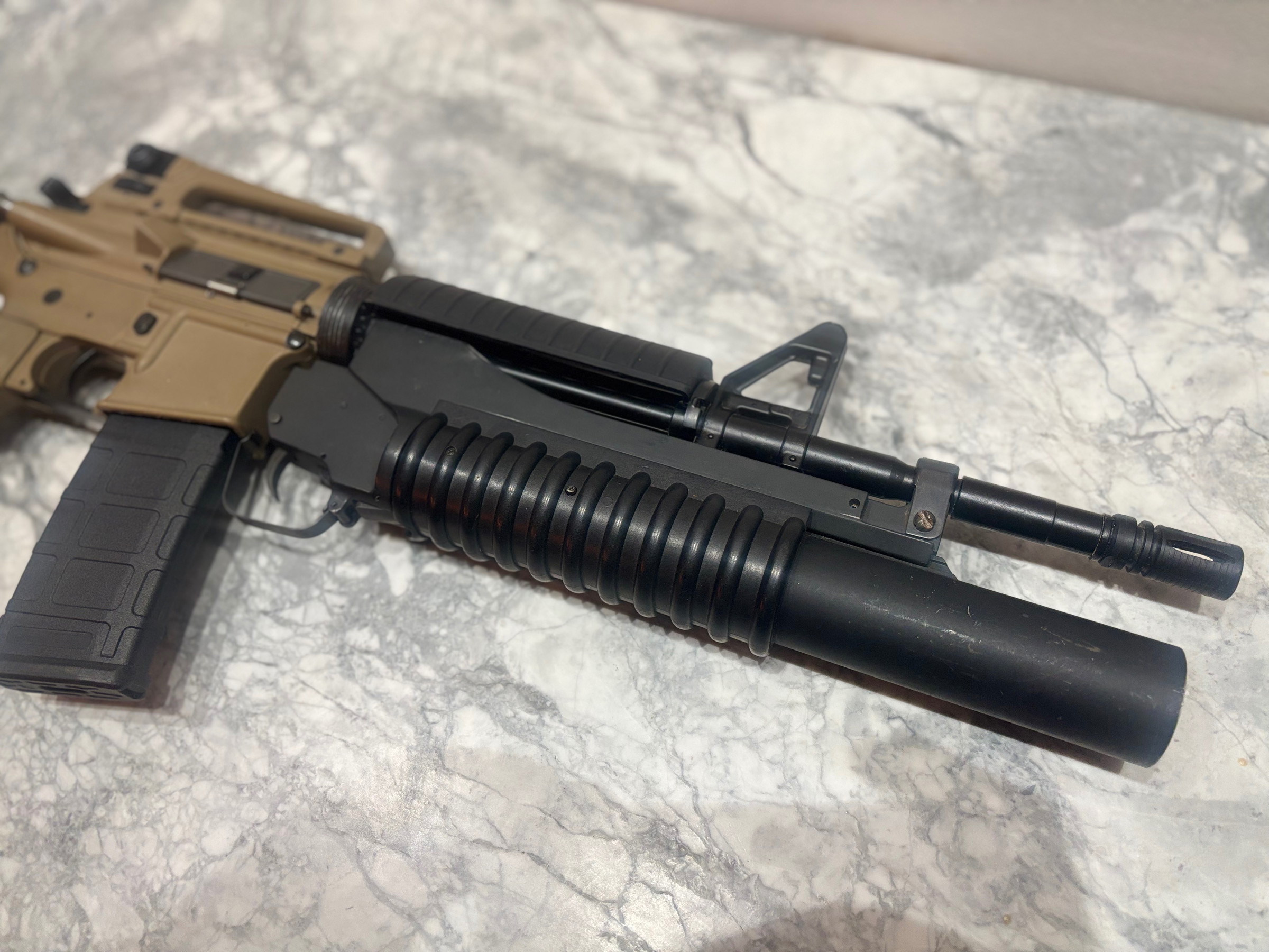 De klassieke look van de CAR15 gecombineerd met een M203 maakt deze replica een gaaf gezicht en opvallend op het veld.