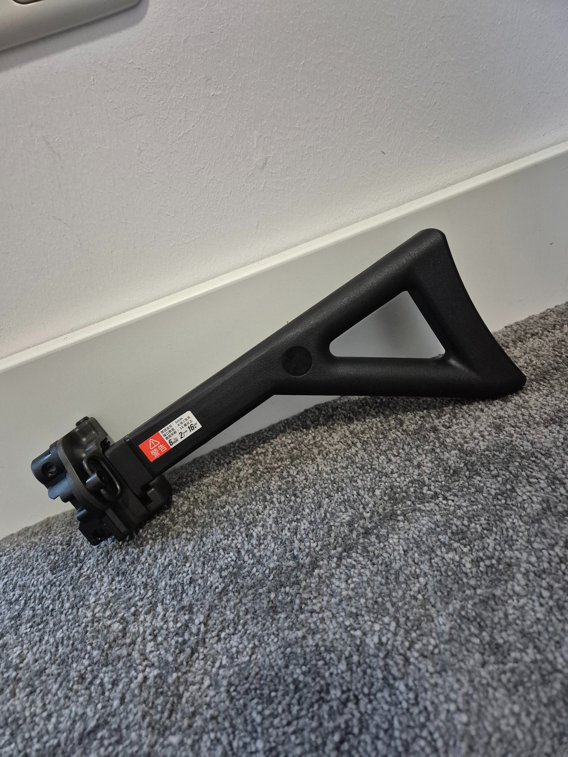 Mp5k PDW Folding Stock. Deze is mil-spec en afkomstig van een gen2 VFC MP5K PDW GBBR. Voorzien van HK trademarks en sling mount.