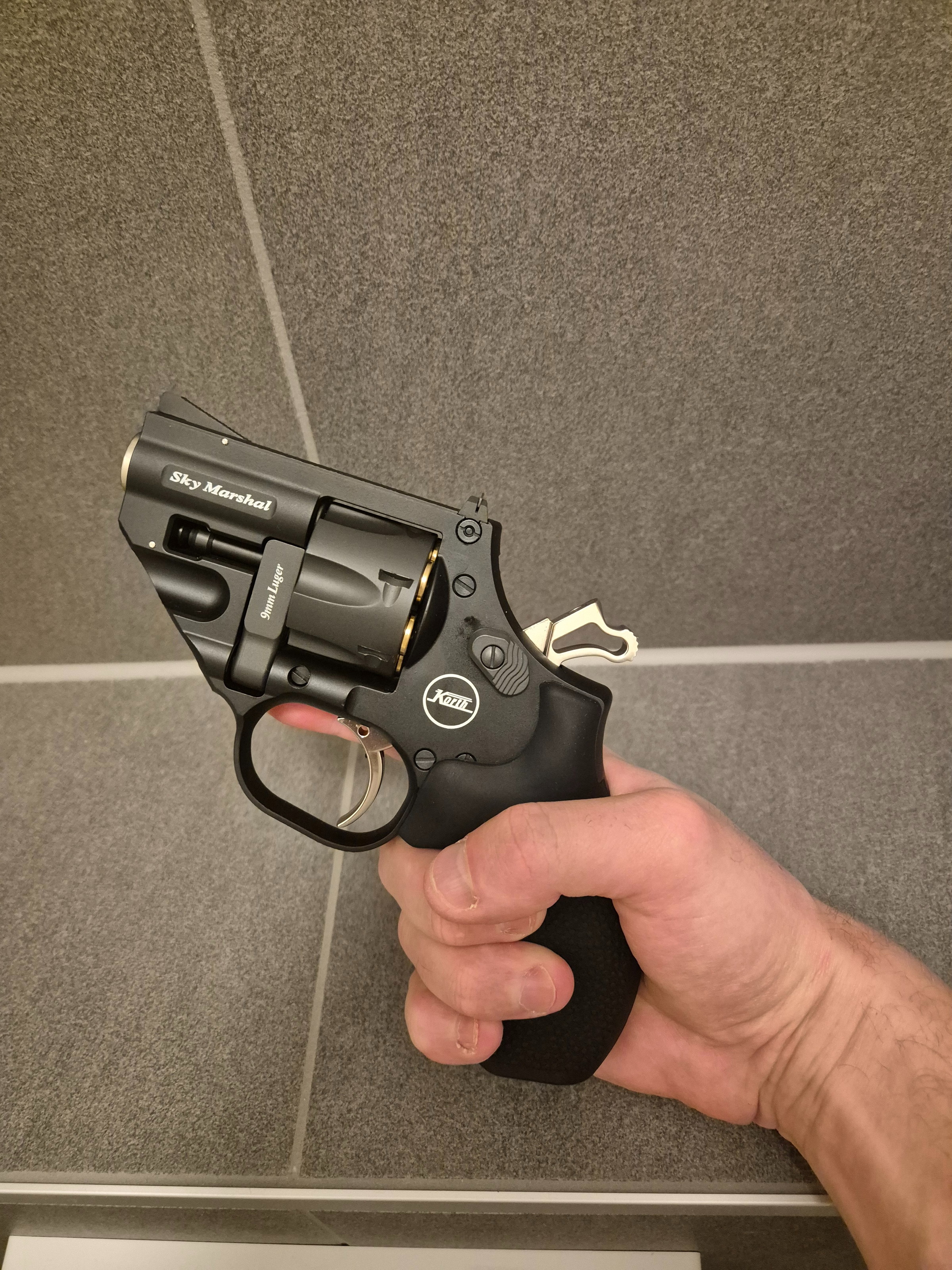 Prachtige volledig metalen 1:1 replica van de Korth Sky Marshal 9mm Revolver. Deze werd gebruikt door beveiligers en agenten in de luchtvaartmaatschappij (vandaar ook zijn naam) en is uitgevoerd in de ongebruikelijke 9mm om over penetratie te voorkomen.