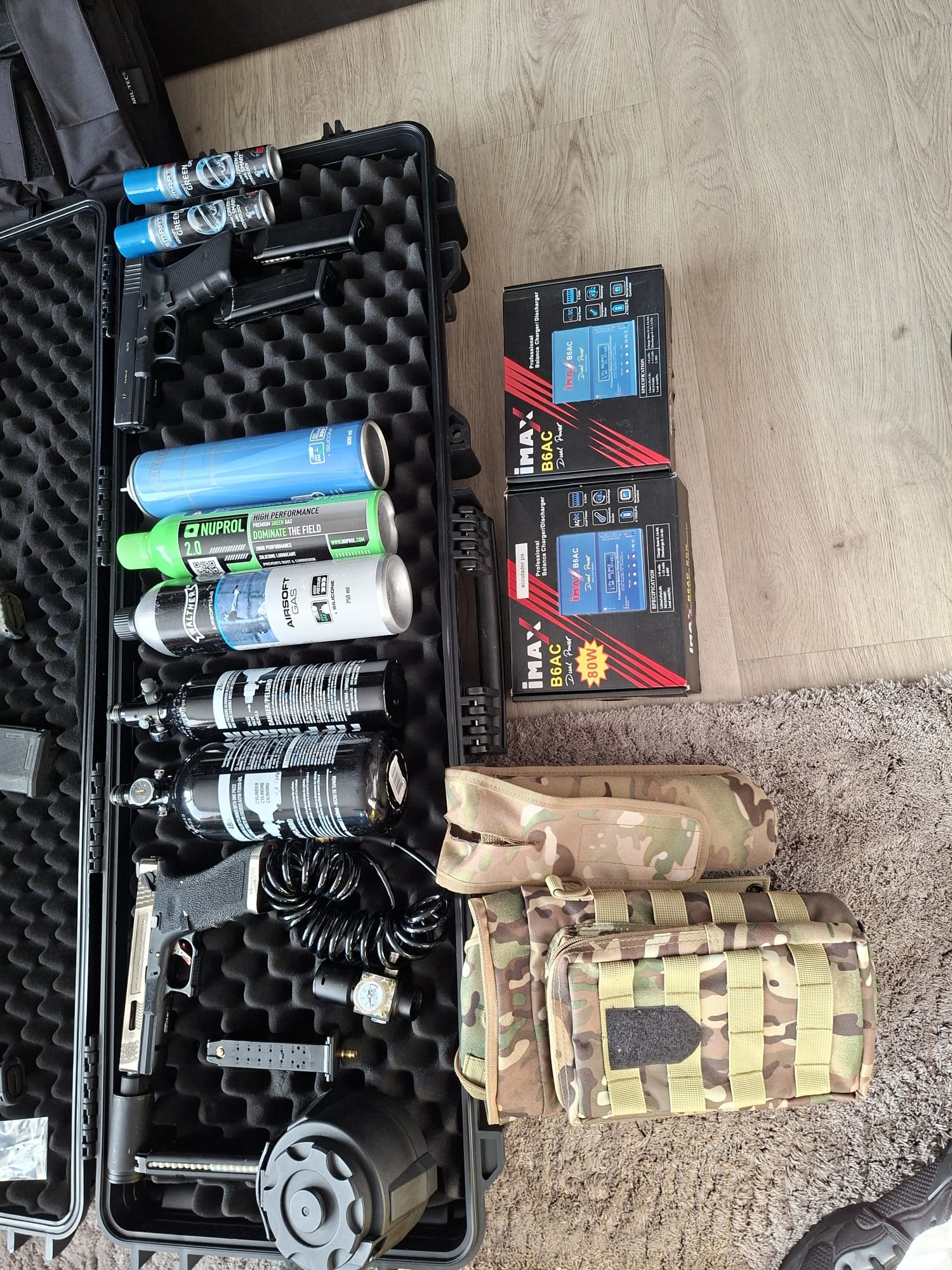 Glock 18 hpa set compleet gebruikt met drum magazijn (hpa) 1 keer magazijn normaal (hpa) 1 keer demper 1 keer reduceer 1 keer hpa fles 48 ci 1 keer hpa fles 26 ci beide flessen met opbergtas