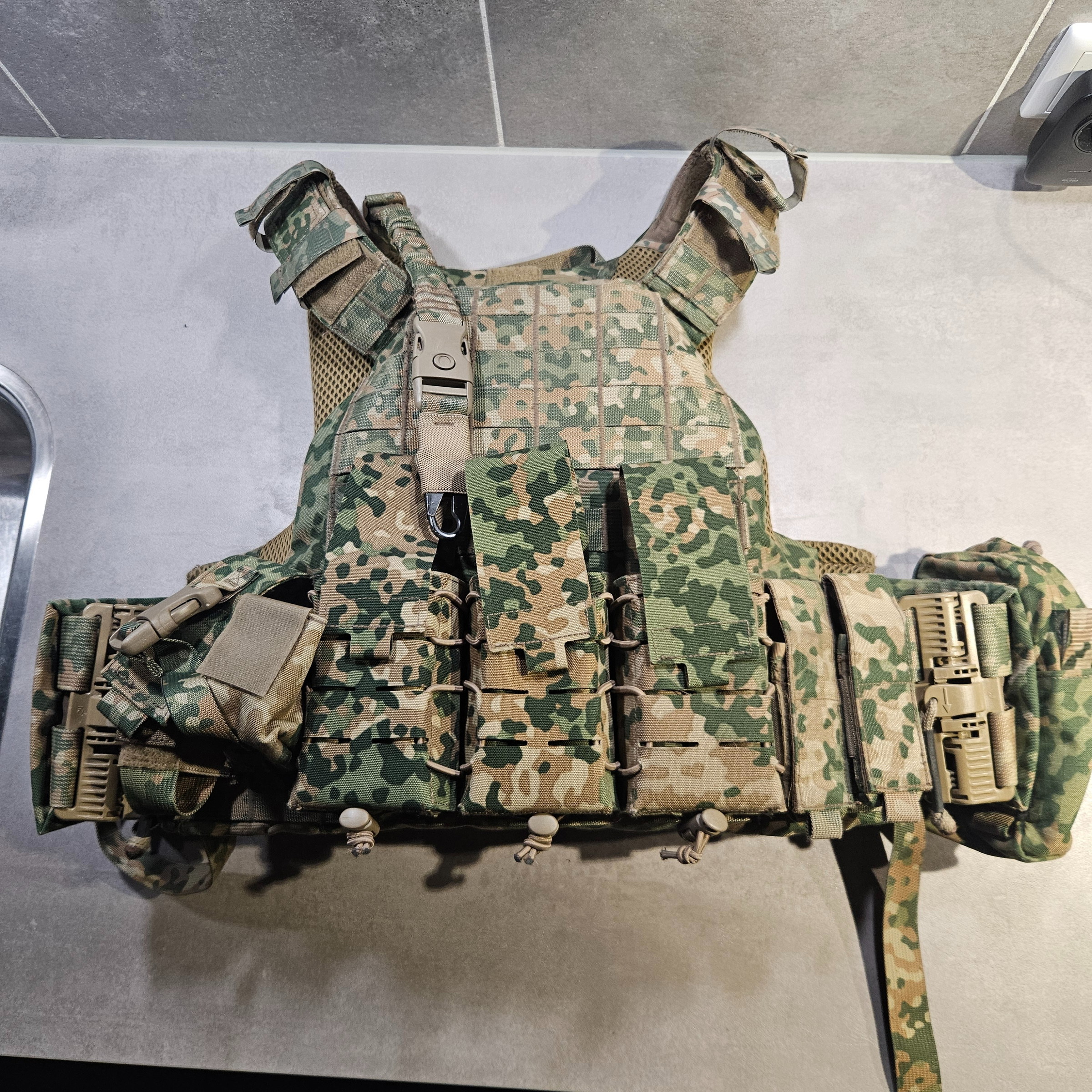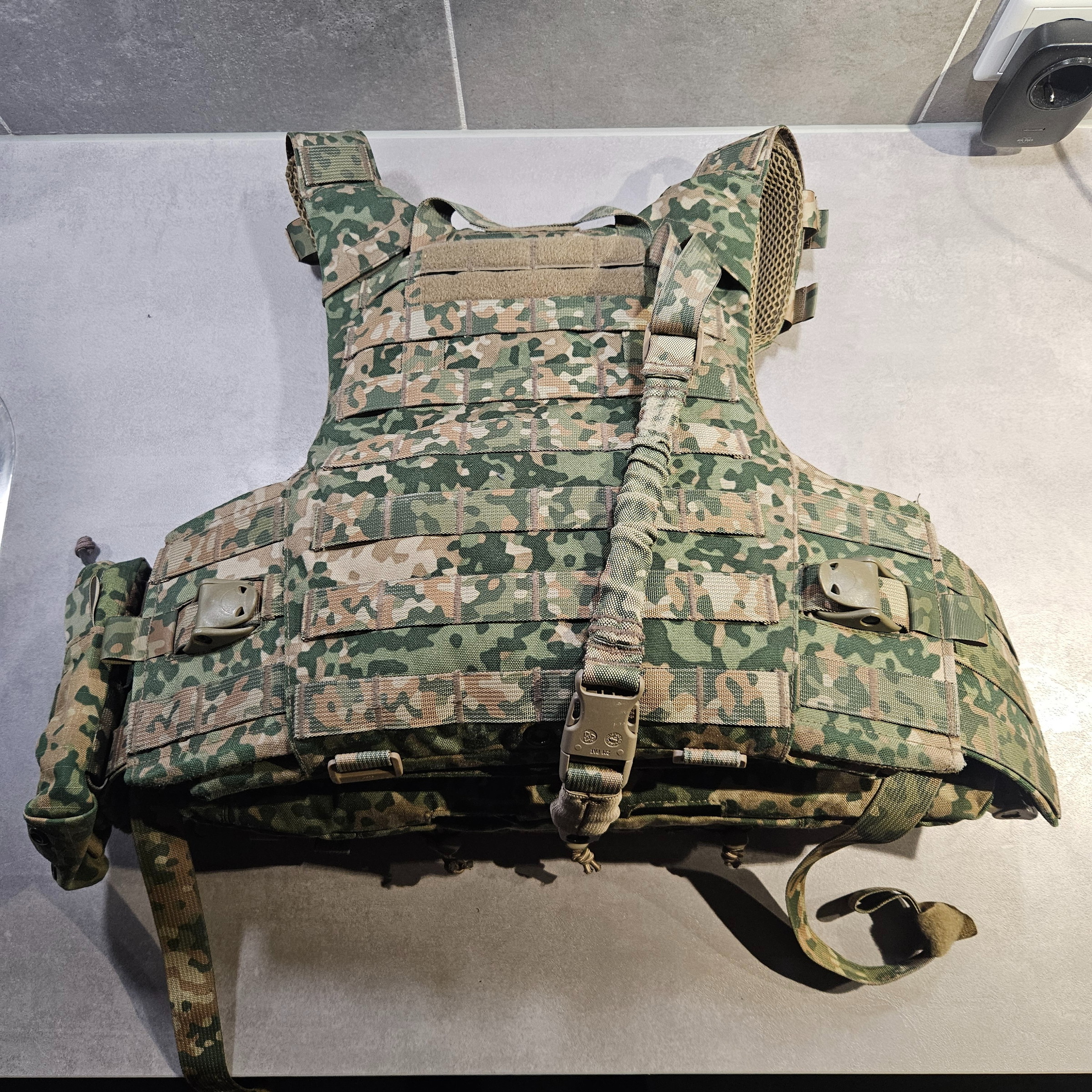 Te koop: hoogwaardige plate carrier in NFP-style camouflage.