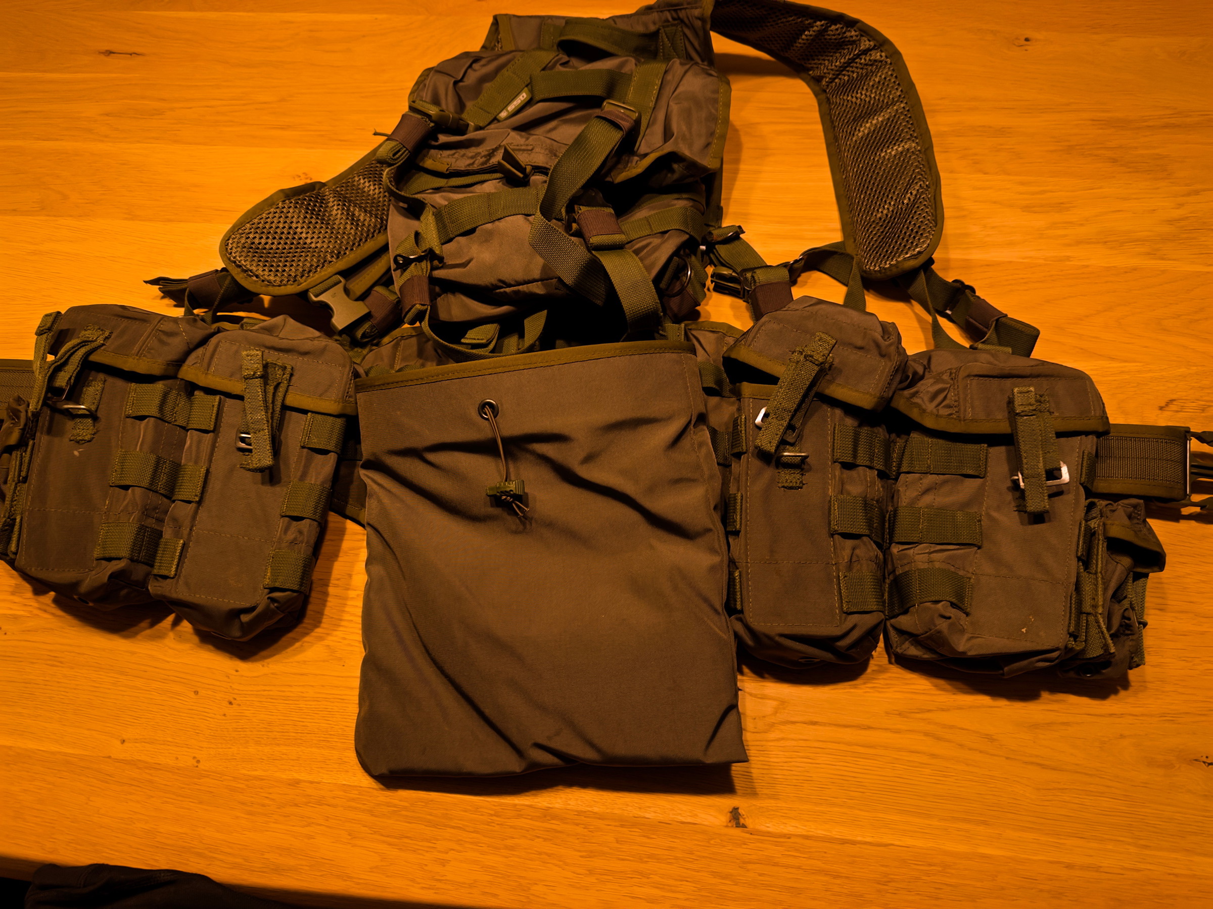 Hij is voorzien van 4x AK pouch voor ieder 2 mags, 2x granaat pouch, dump pouch en kleine backpack. Werkt mega goed als je een AK platform runt.