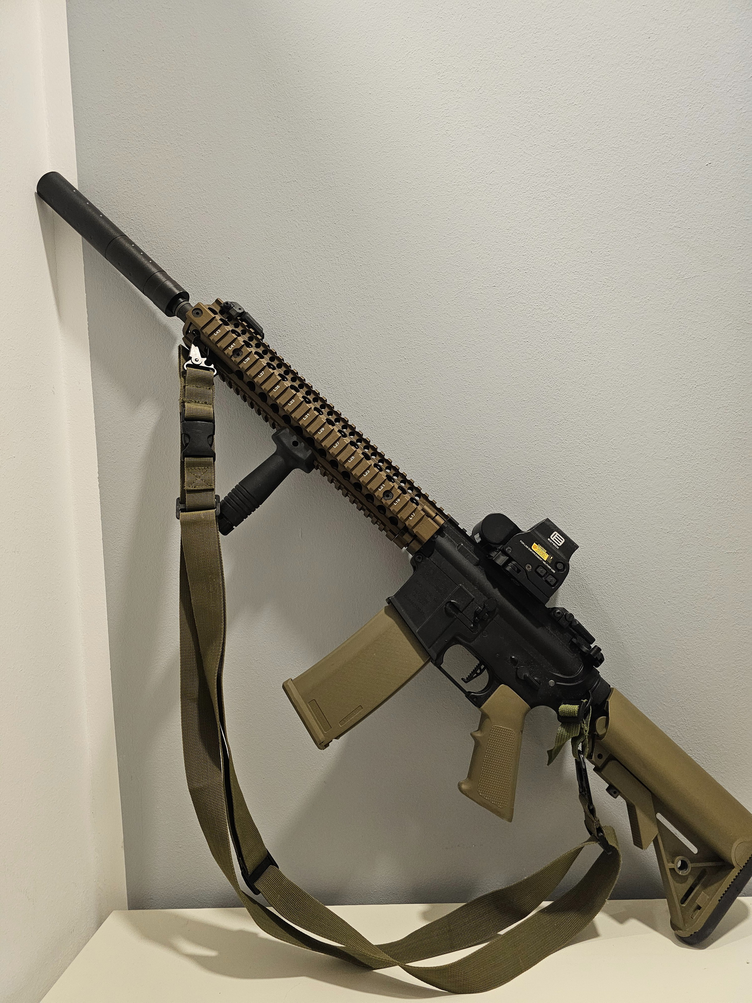 Specna ArmsDaniel Defense SA-E26 EDGE HAL ETU Chaos Bronze mit einem Schalldämpfer einem Visier und mehreren Magazinen an. Bei Interesse oder weiteren Fragen gerne Melden