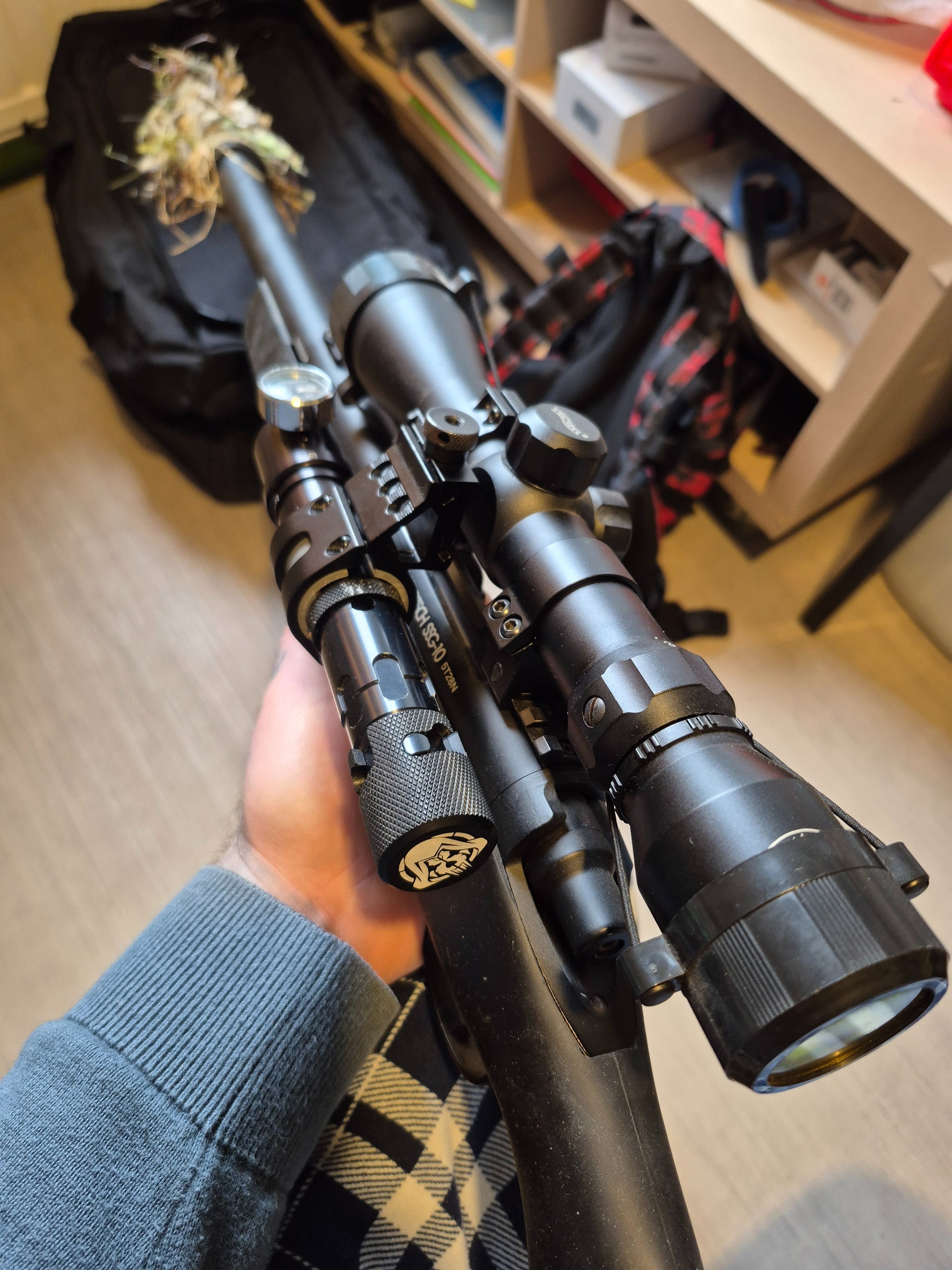 Ssg10 met wolverine bolt e korte outer barrel lange innerbarrel met inner barrel stabilisizer in demper  co2 set of hpa kan je zelf kiezen tridos tdc en cammo set eventuweel met guillie set voor meerprijs kijk andere advertenties vest met kap broek en smal harnas voor magazijnen met 5 pounces aan de belt