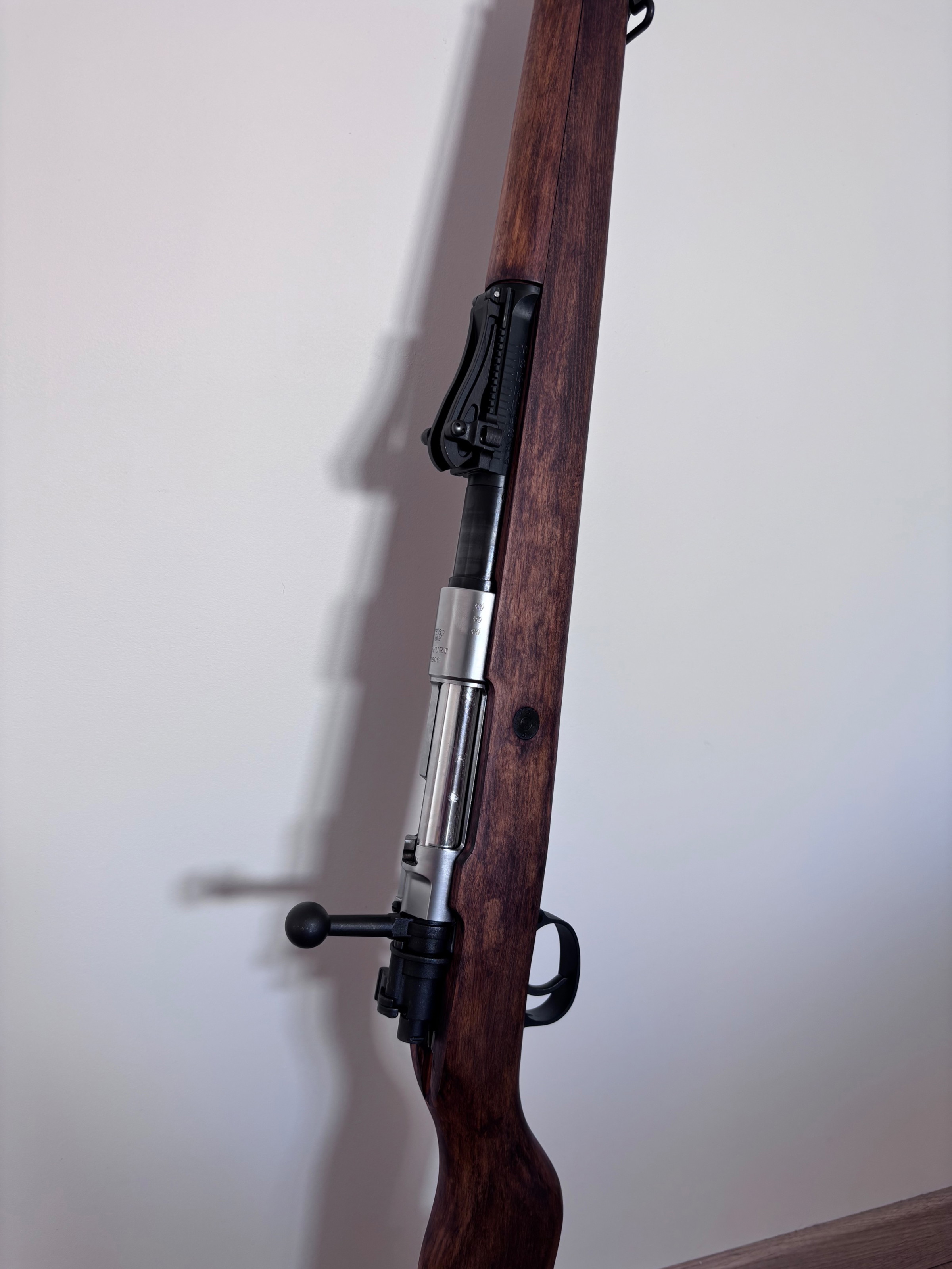 Construction full acier excepté la culasse en alliage. Pour patiner cette partie, je recommande le birchwood casey aluminium black ( tutos dispos sur YouTube sur comment faire et sur le résultat) car leur dernière production de gewehr avait vocation à reproduire des G98 sorties d’usine (chromés et bois très clair).
