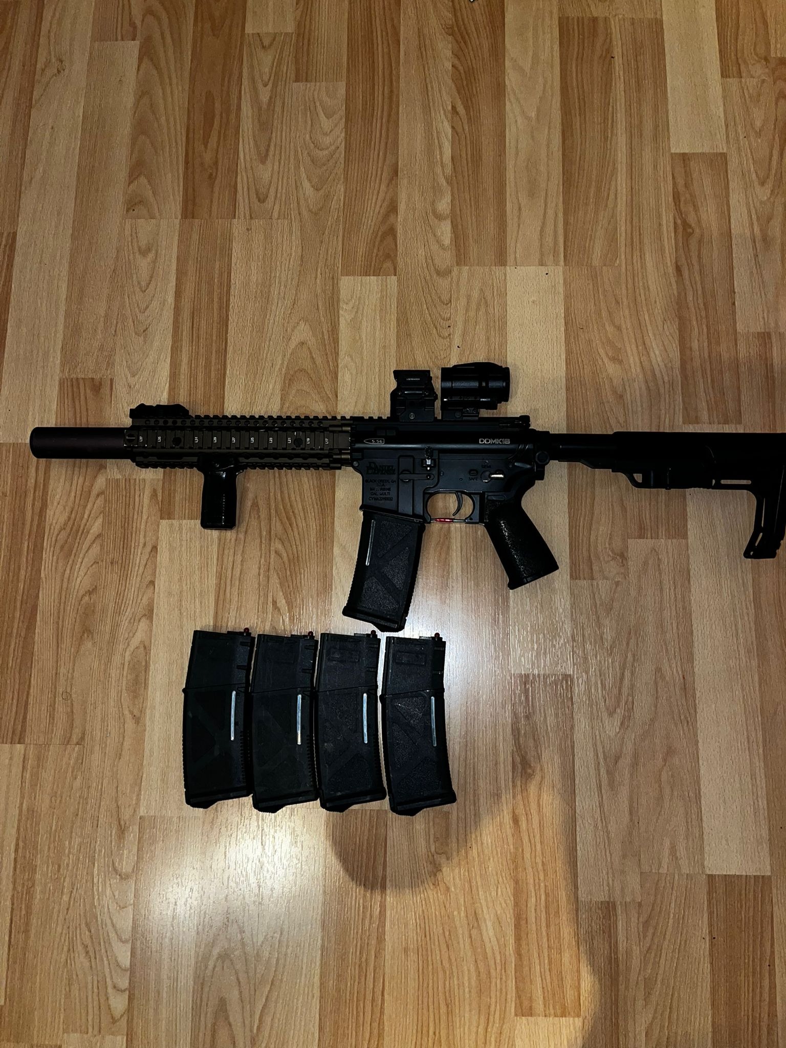 Begadi M4 NOVA Daniel Defense MK18Look S AEG Voll getunt Schalldämpfer Red Dot mit Booster 5 Mag.