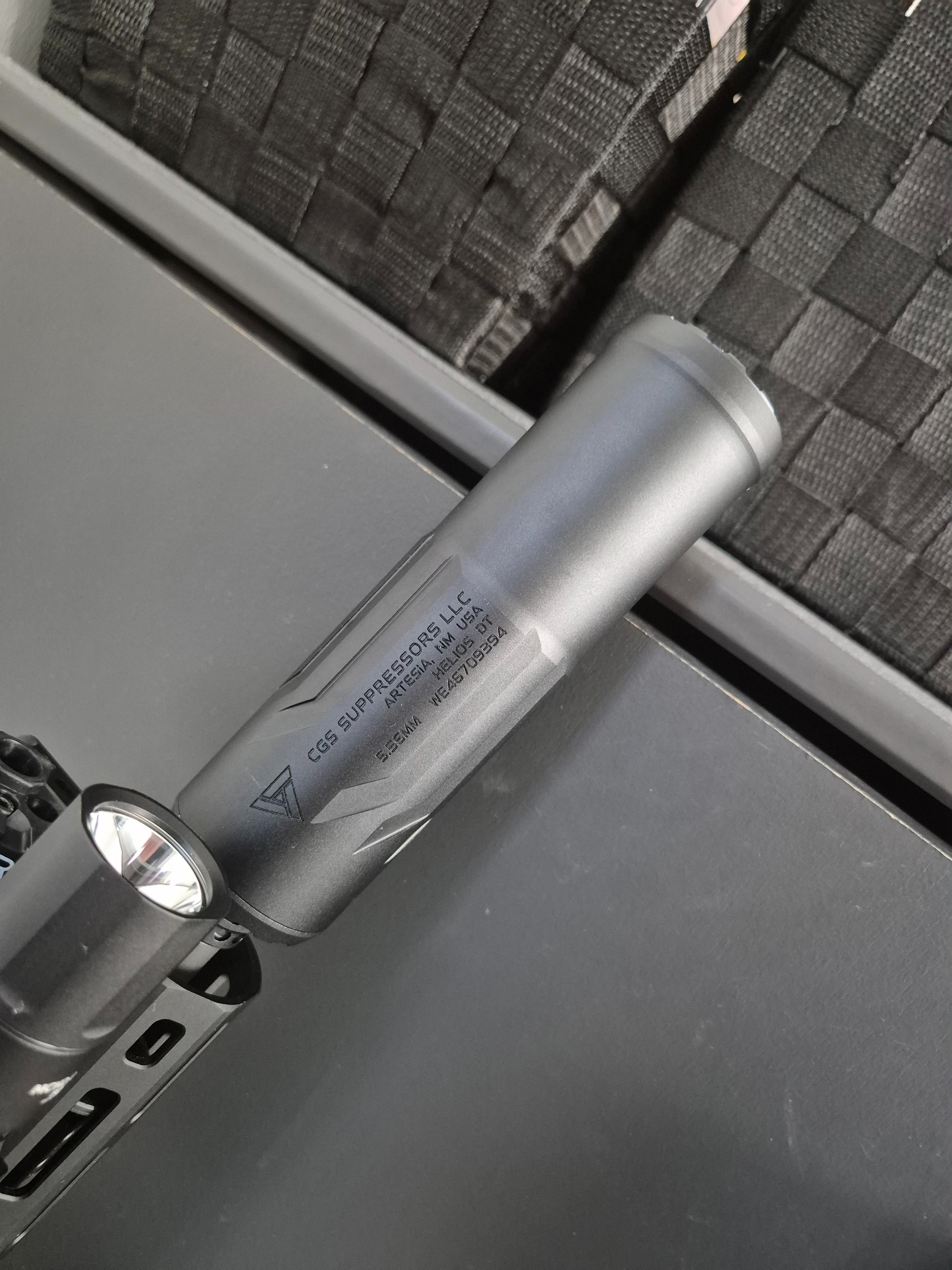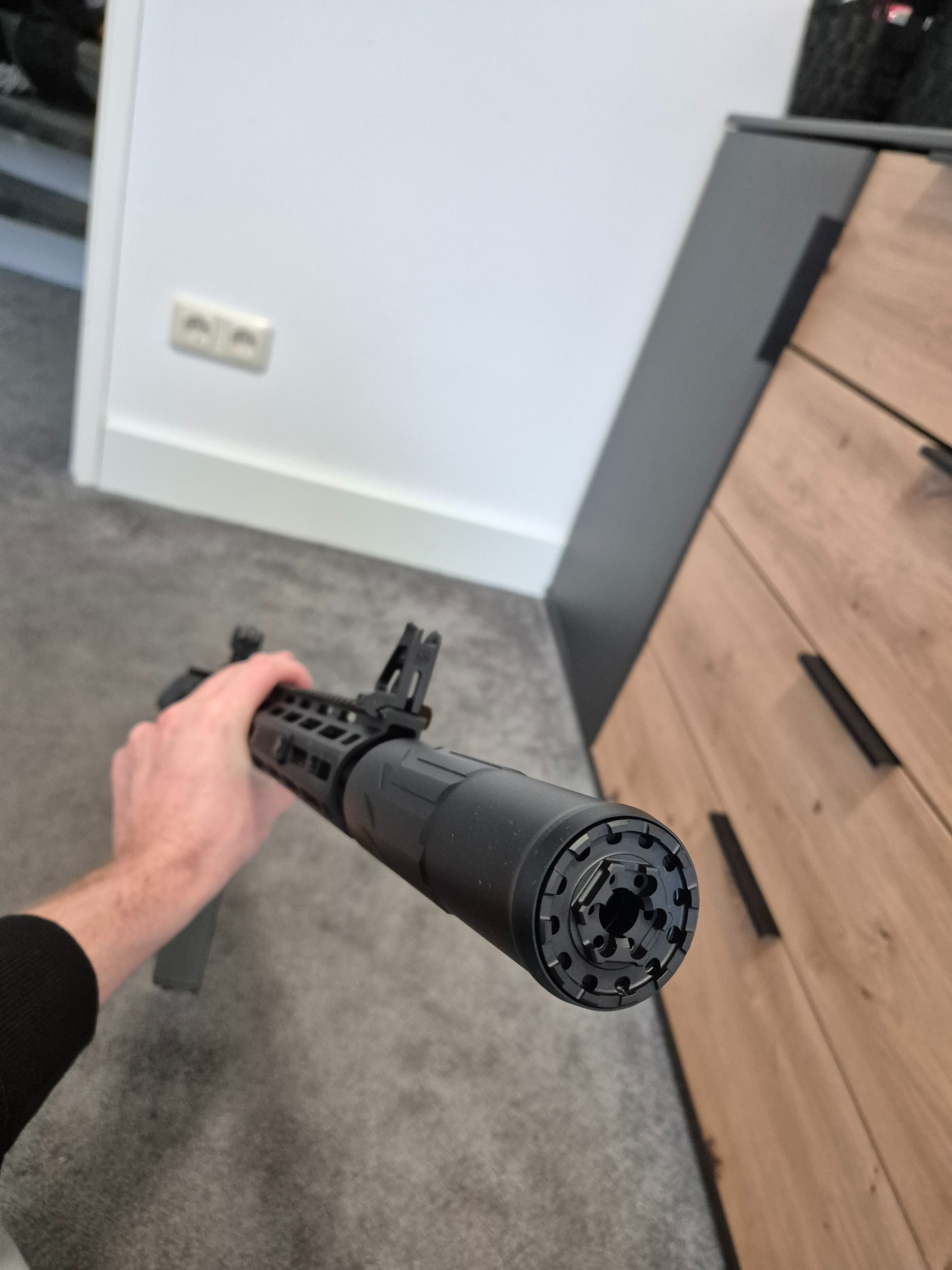 EMG CGS Helios DT Supressor. Nieuw in de verpakking, alleen gemonteerd om foto's te maken. Is een 1:1 replica van de real steel CGS Helios supressor. Net zoals de echte is het een direct thread supressor die direct op de loop bevestigd word, zonder flashhider. Geschikt voor 14mm ccw schroefdraad.