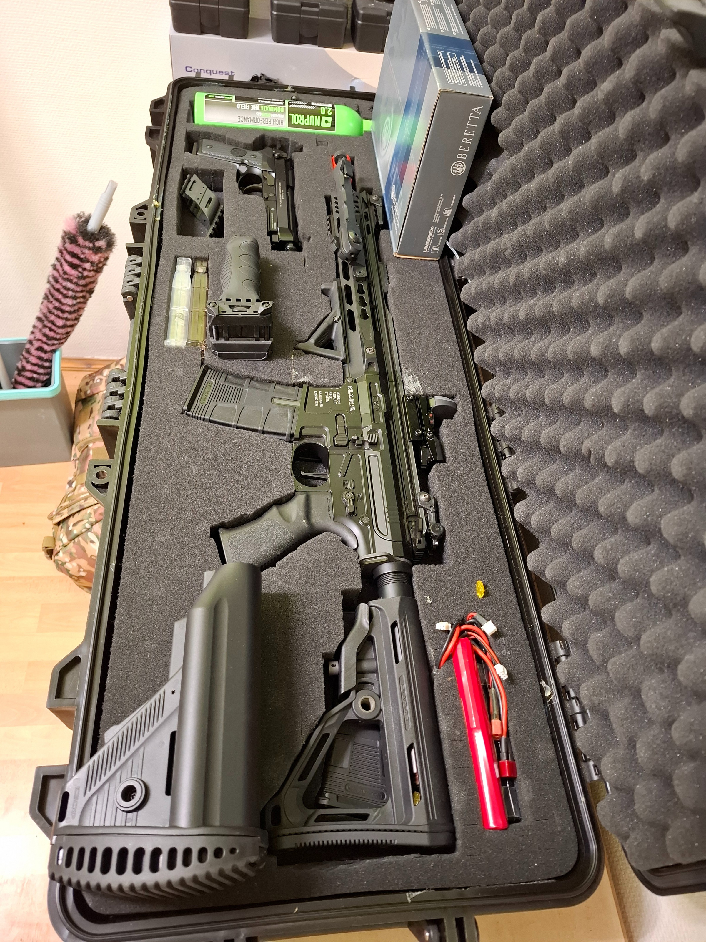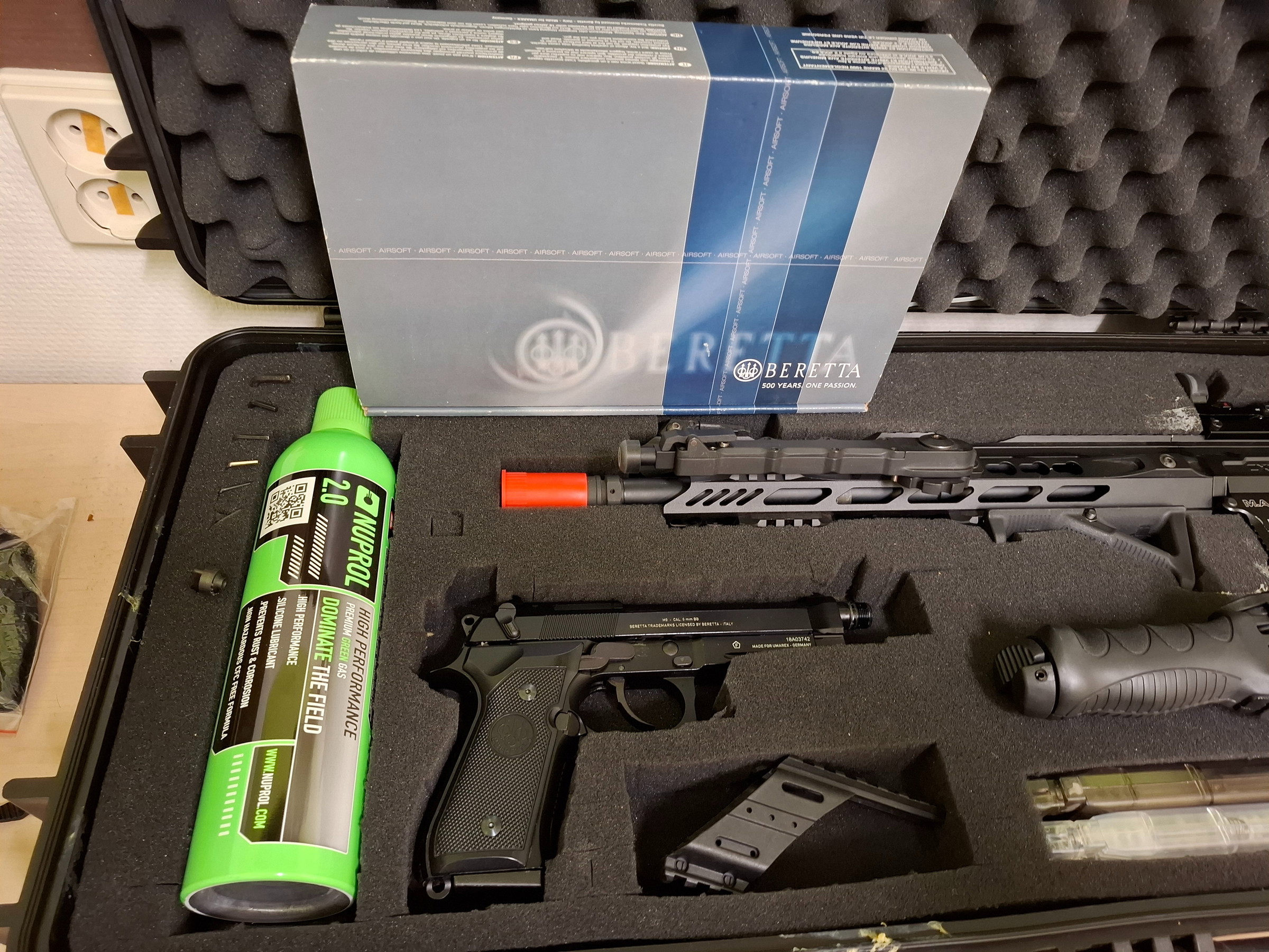 Compleet met koffer en toe behoren. ICS MARS carabine. Extra trigger unit voor burst mode. Baretta pistool full metal.