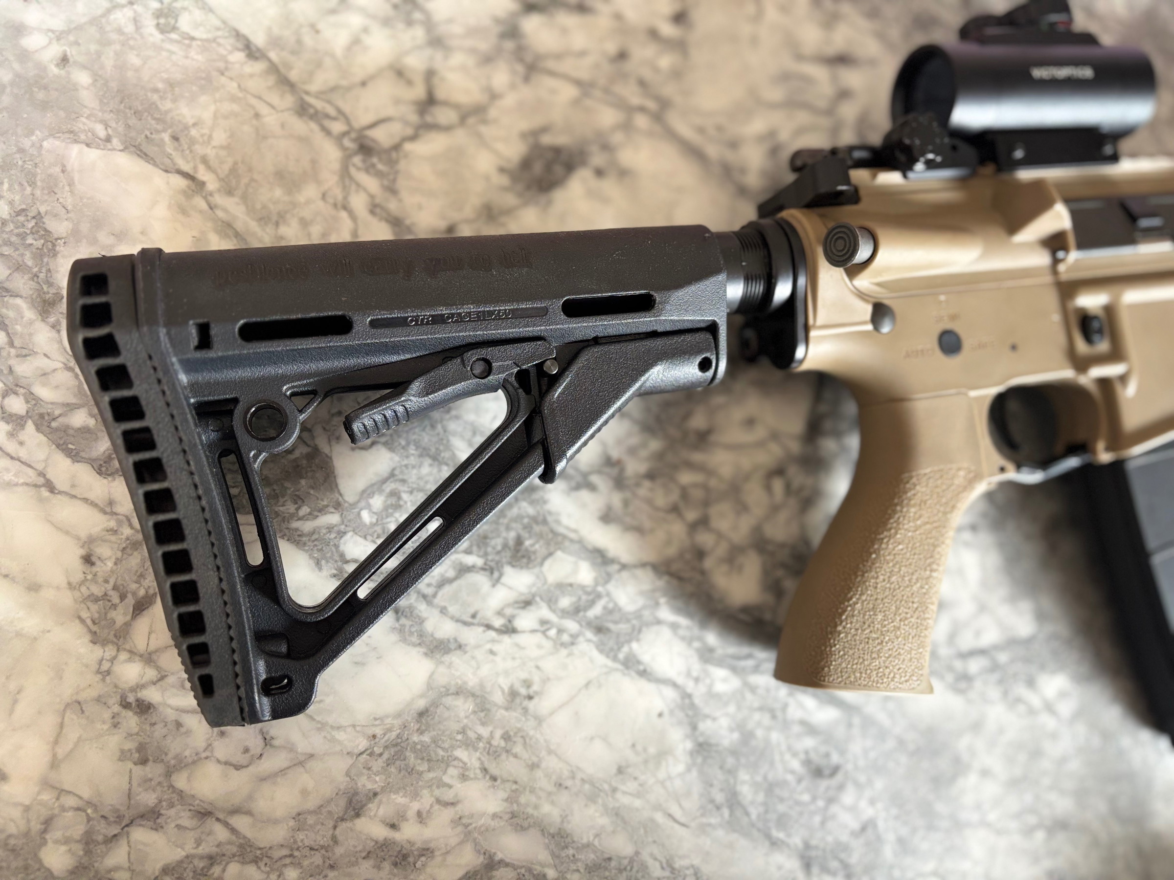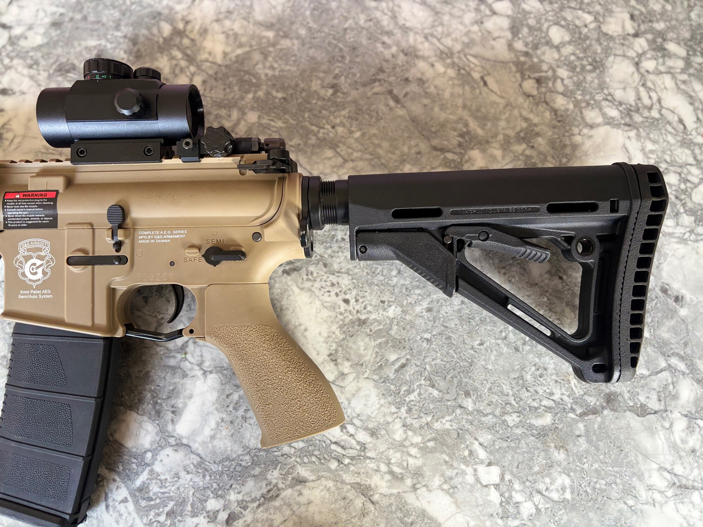 De stock is vervangen voor een Magpul CTR. Vorige eigenaar had hier een tekst in gegraveerd en tekst rood gemaakt, deze heb ik weer zwart gemaakt en valt nu minder op.