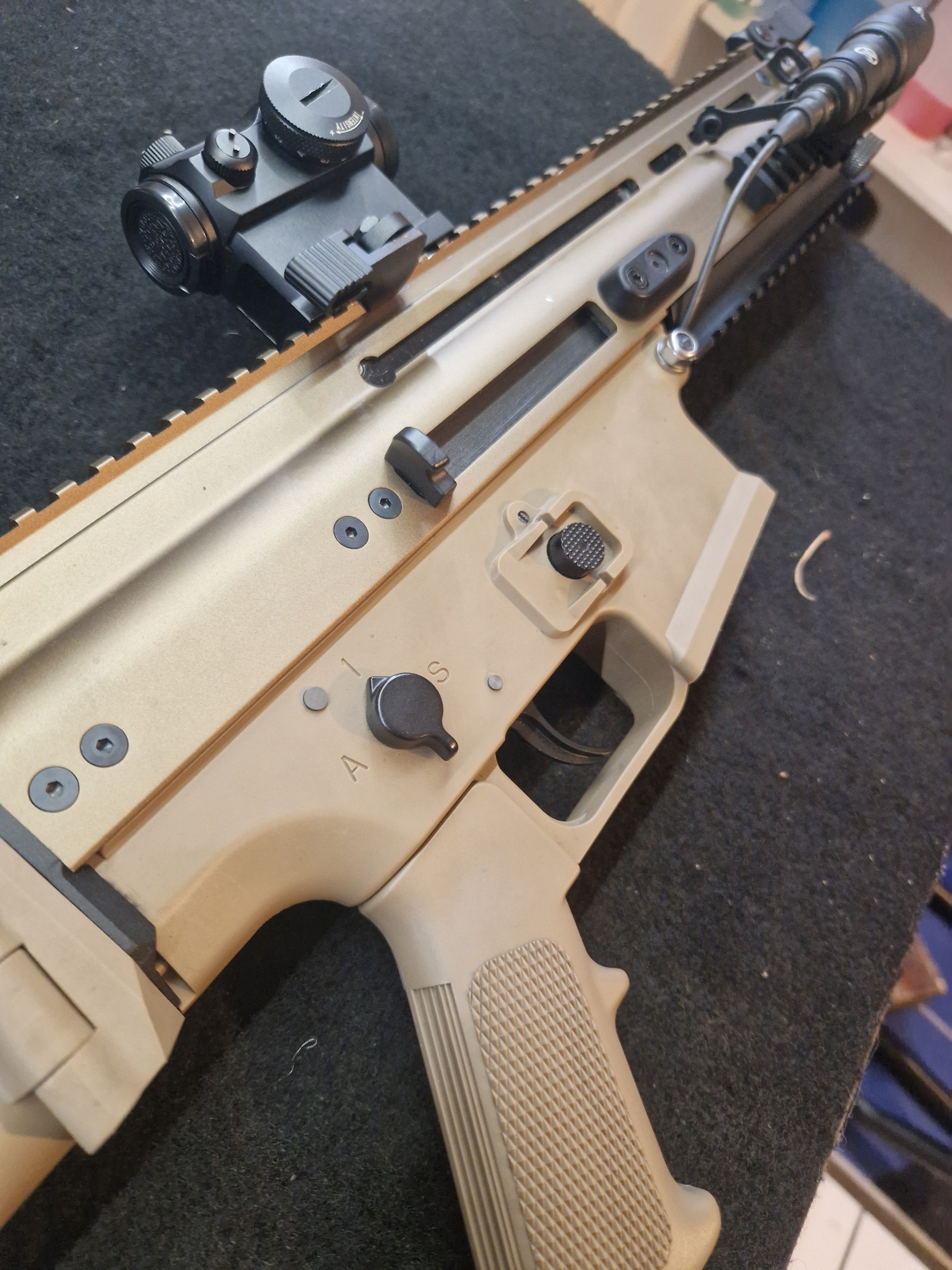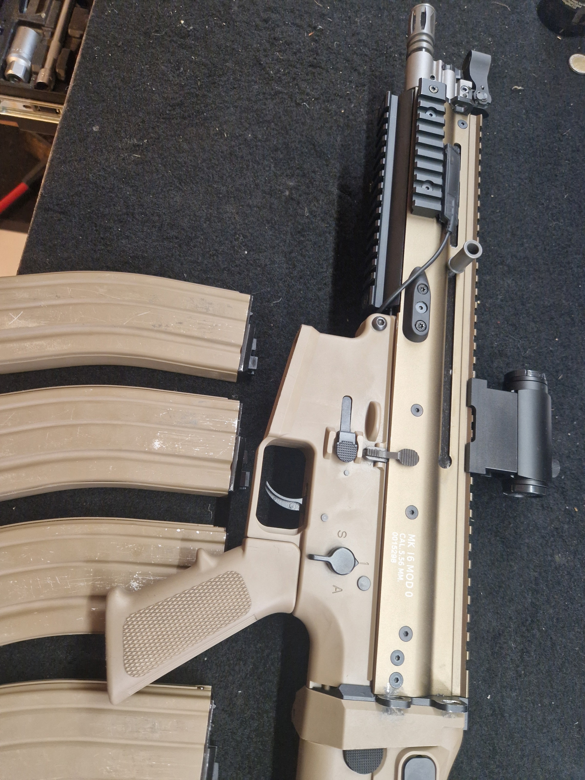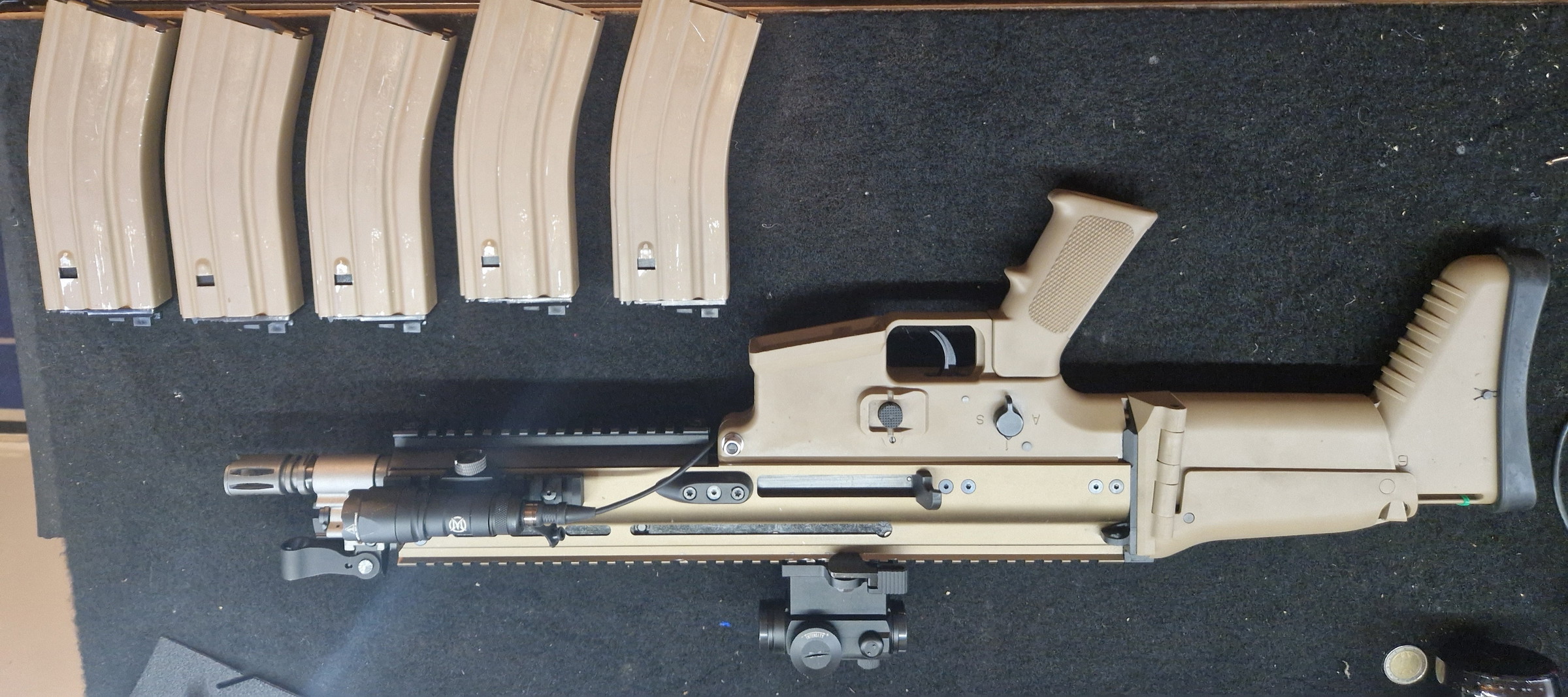 Hierbij verkoop ik mijn Scar-L GBB rifle in dessert tan kleur. Deze replica staat bekend om het open bolt systeem en de bewegende bol Replica is slechts 2 keer met een skirm gebruikt en 2/3 keer mee geschoten bij de NABV. De replica is geupgrade met de volgende delen, onderstaand is inclusief: