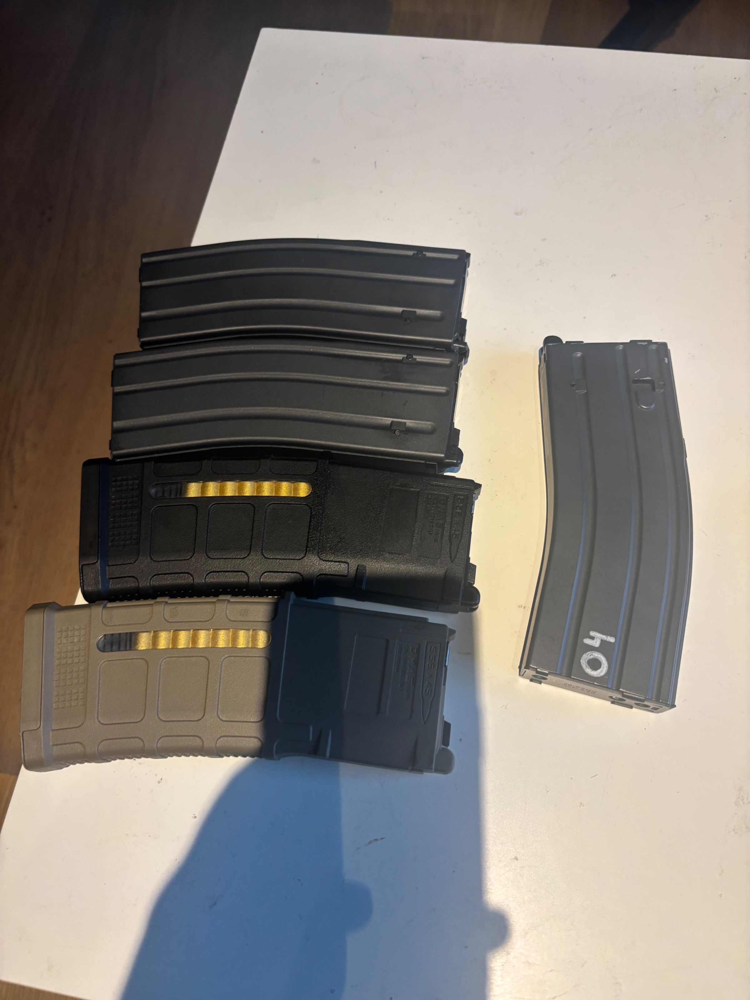 Komt 4 defecte magazijnen bij. ( 2 ervan lekken en de andere 2 hebben gewoon nieuwe feeding lips nodig ) daarnaast komt 1 werkend magazijn bij die gemarkeerd is met 04Β