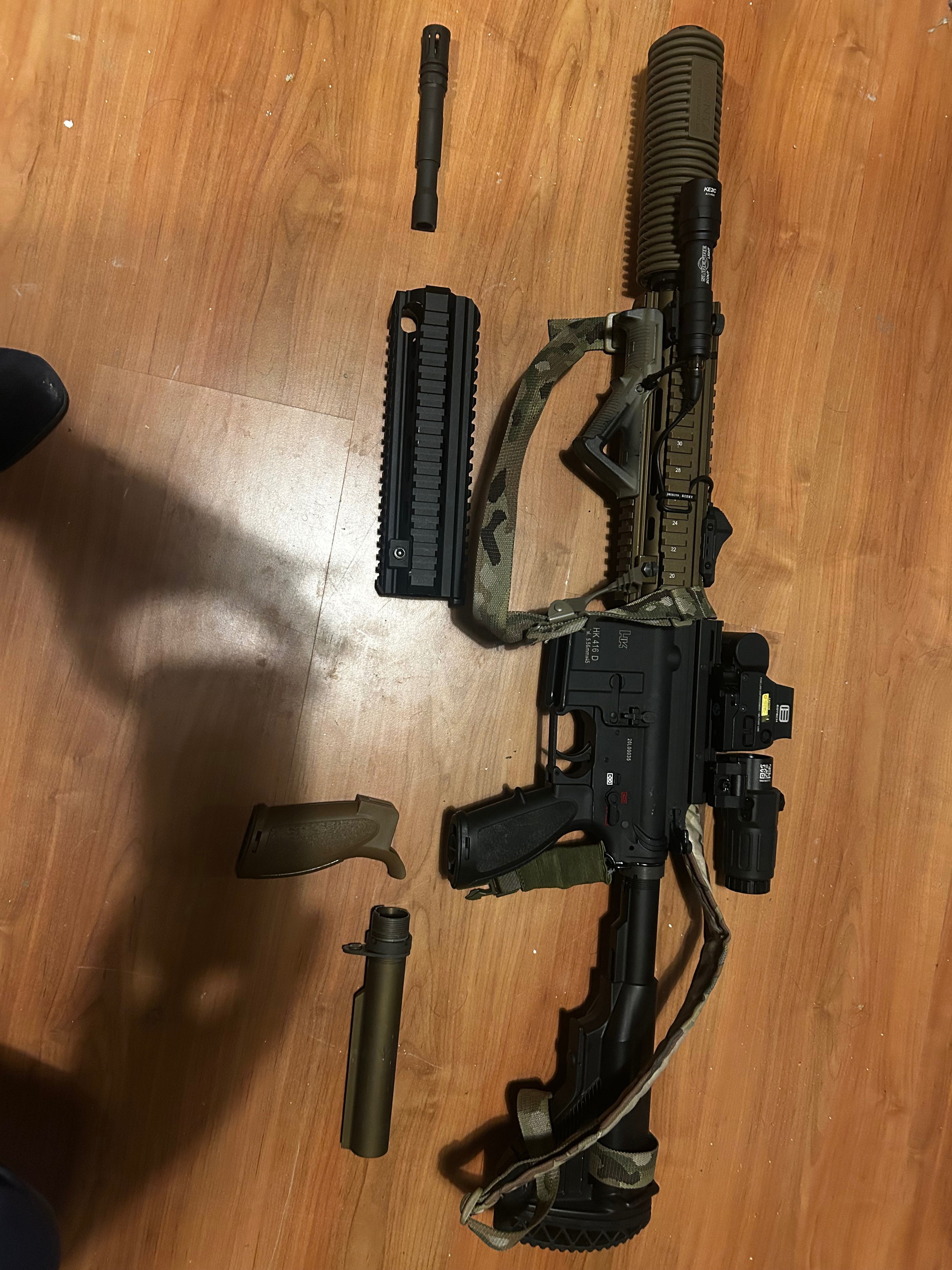 Te koop aangeboden: Umarex HK416 GBBR V2 met 5 lekvrije magazijnen en bronze+zwarte rails/buffertube/grip.Β