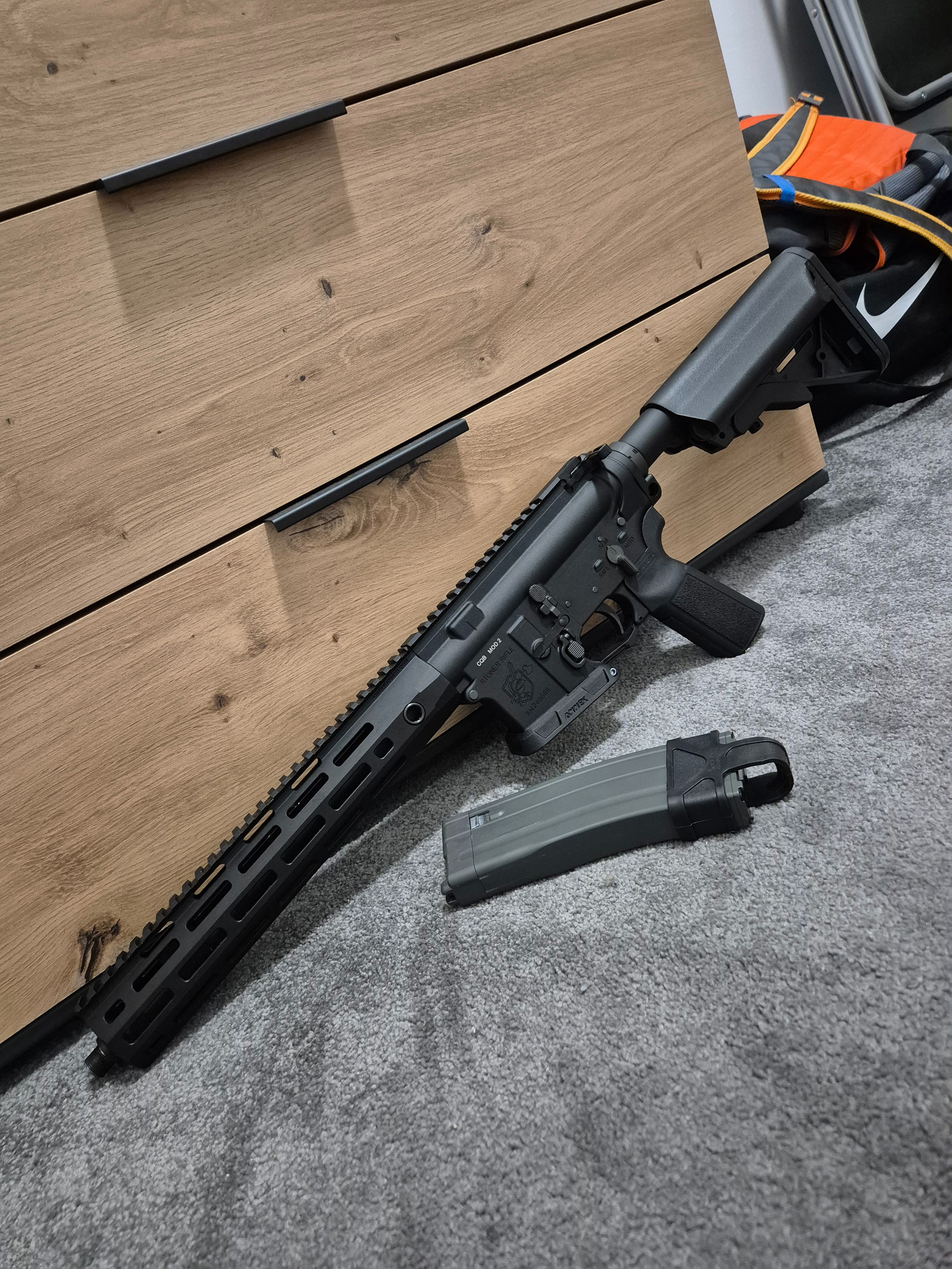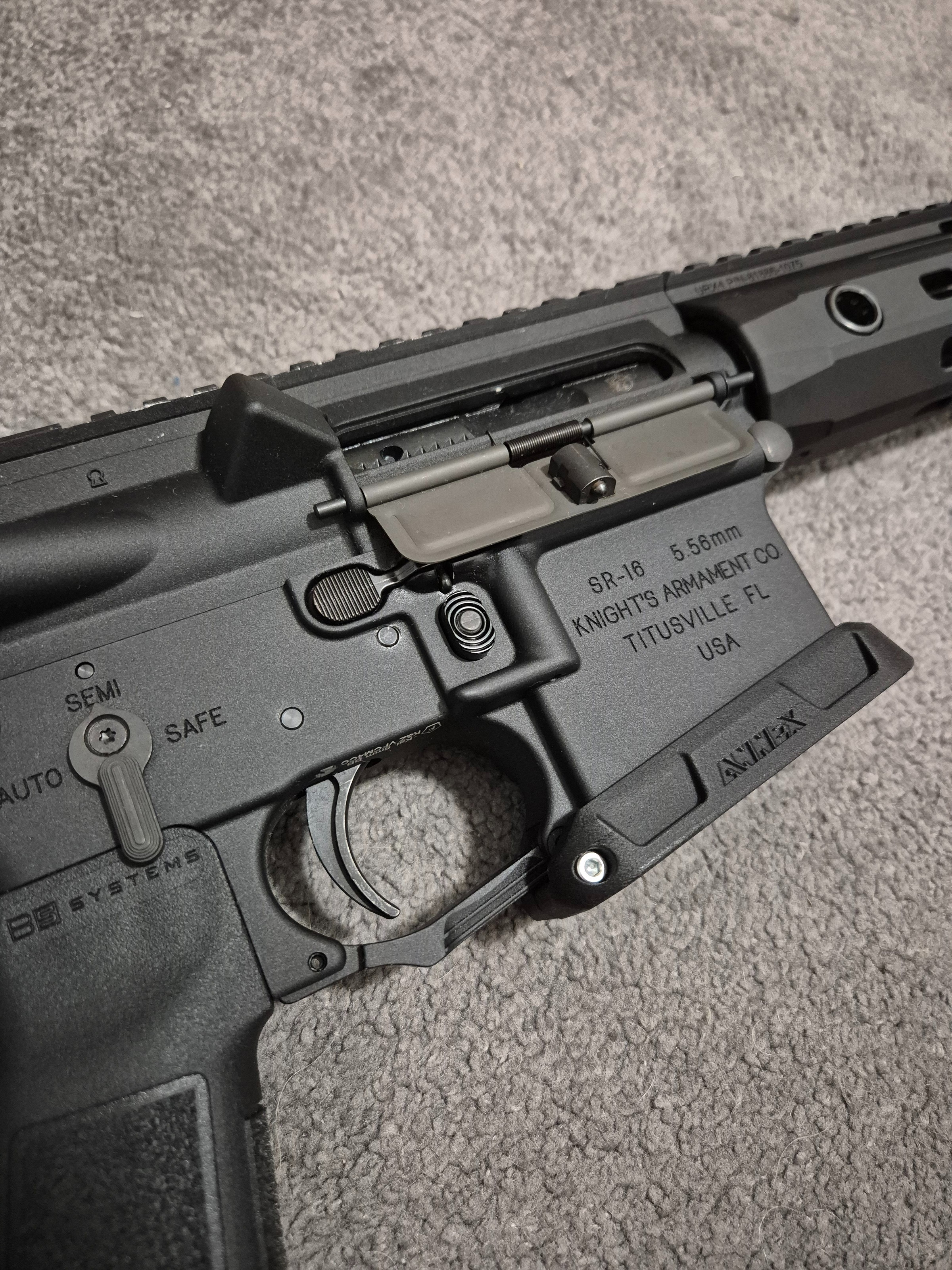 De replica is voorzien van alle orginele trademarks, op de lower en upper receiver, handguard en zelfs de bolt. Hij heeft de perfecte middelengte van 11.5", en heeft volledige links- en rechtshandige controls. De rail is dun en voorzien van m-lok op alle posities. Vergeleken met de RIII, URGI en BCM rails is dit absoluut mijn favoriet. De gehele replica is als een tank gebouwd. Geen wobble en geen ratelingen.Β