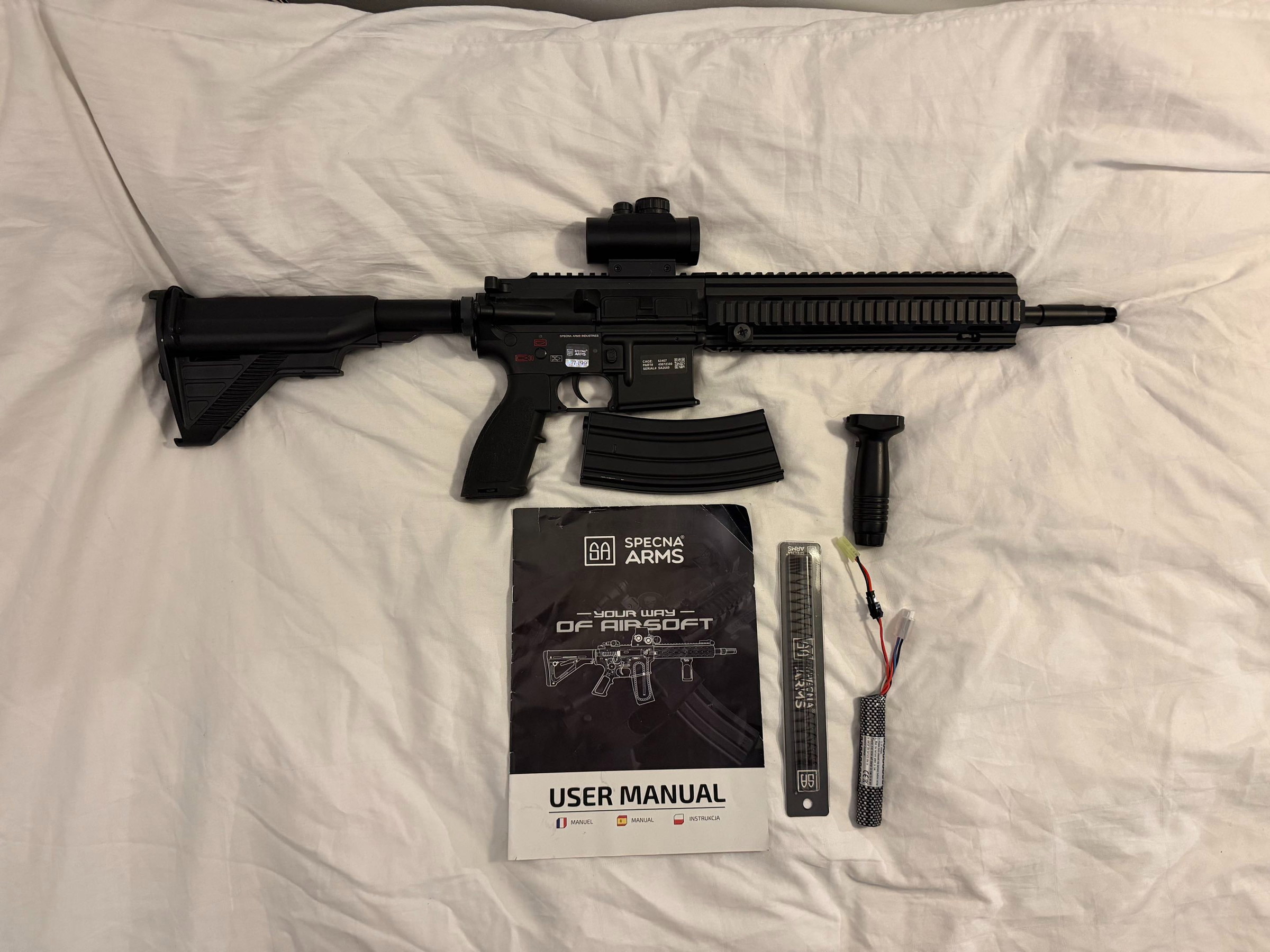 Red Dot sight, Front grip, 1x Hi-cap mag.