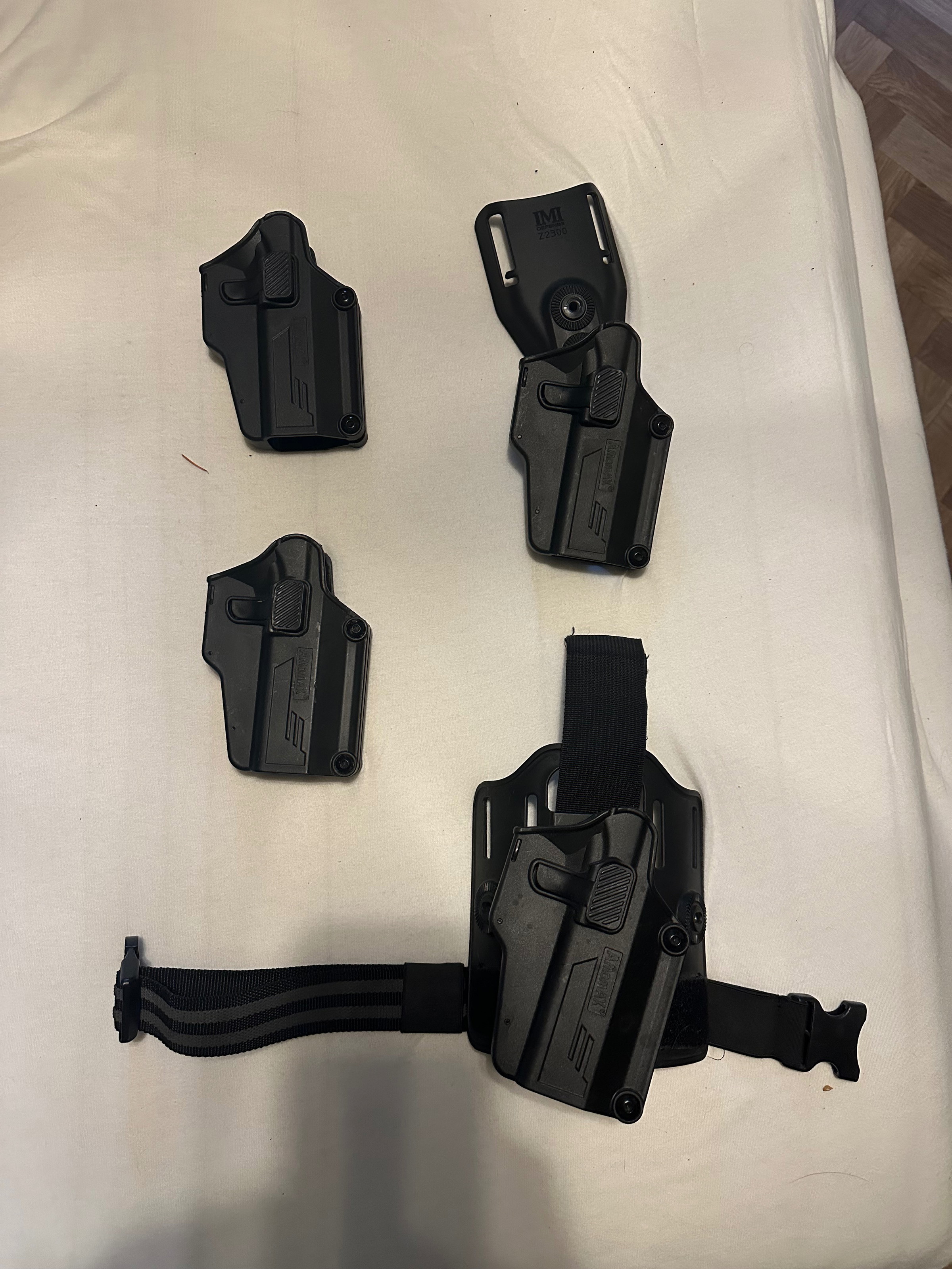 Vier amomax holsters, volgens mij zijn ze universeel. Twee hebben al een adapter eraan voor aan je riem.