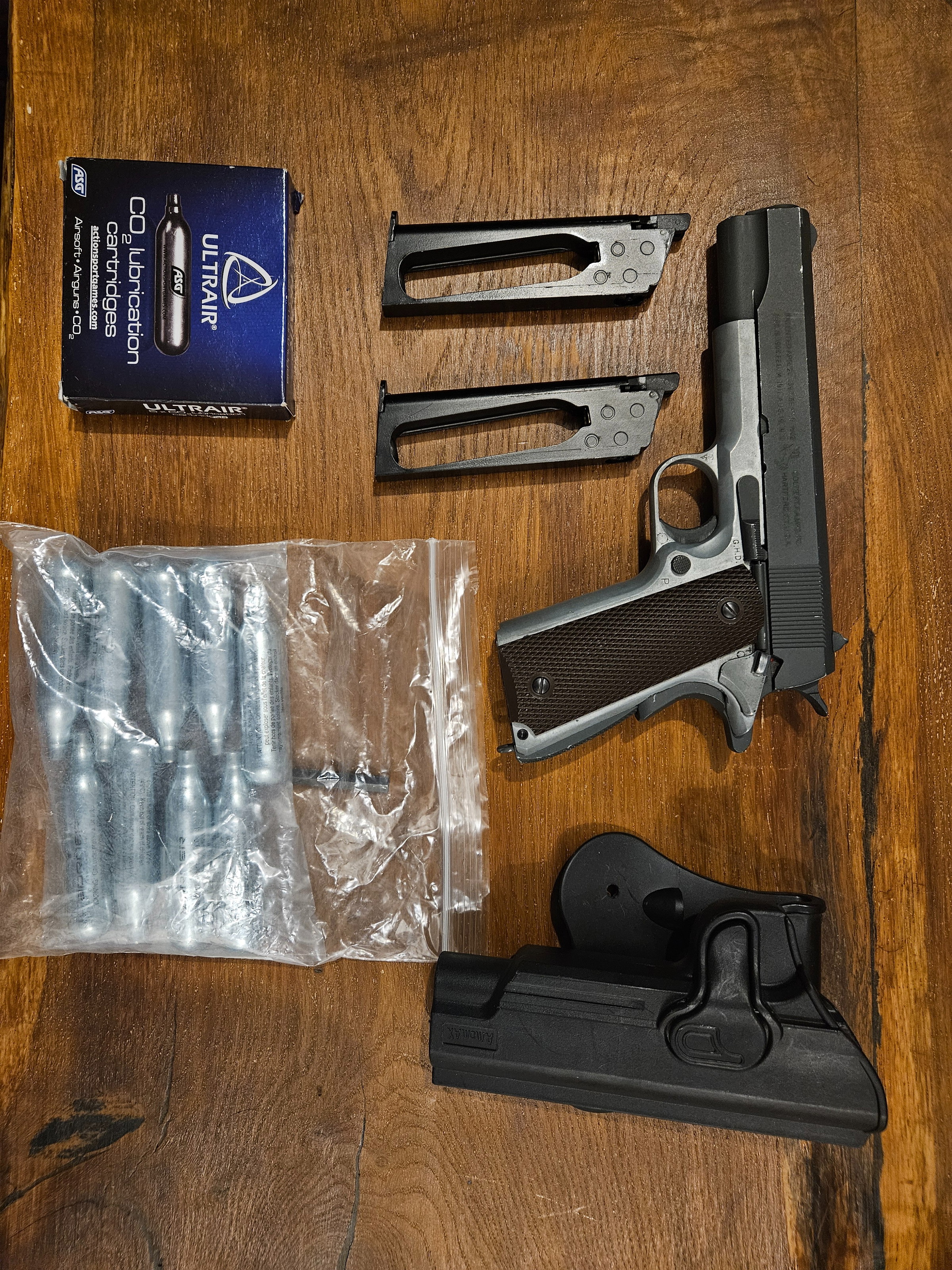 Inclusief 2 dichte magazijnen, CO2 patronen CO2 onderhouds patronen en holster.