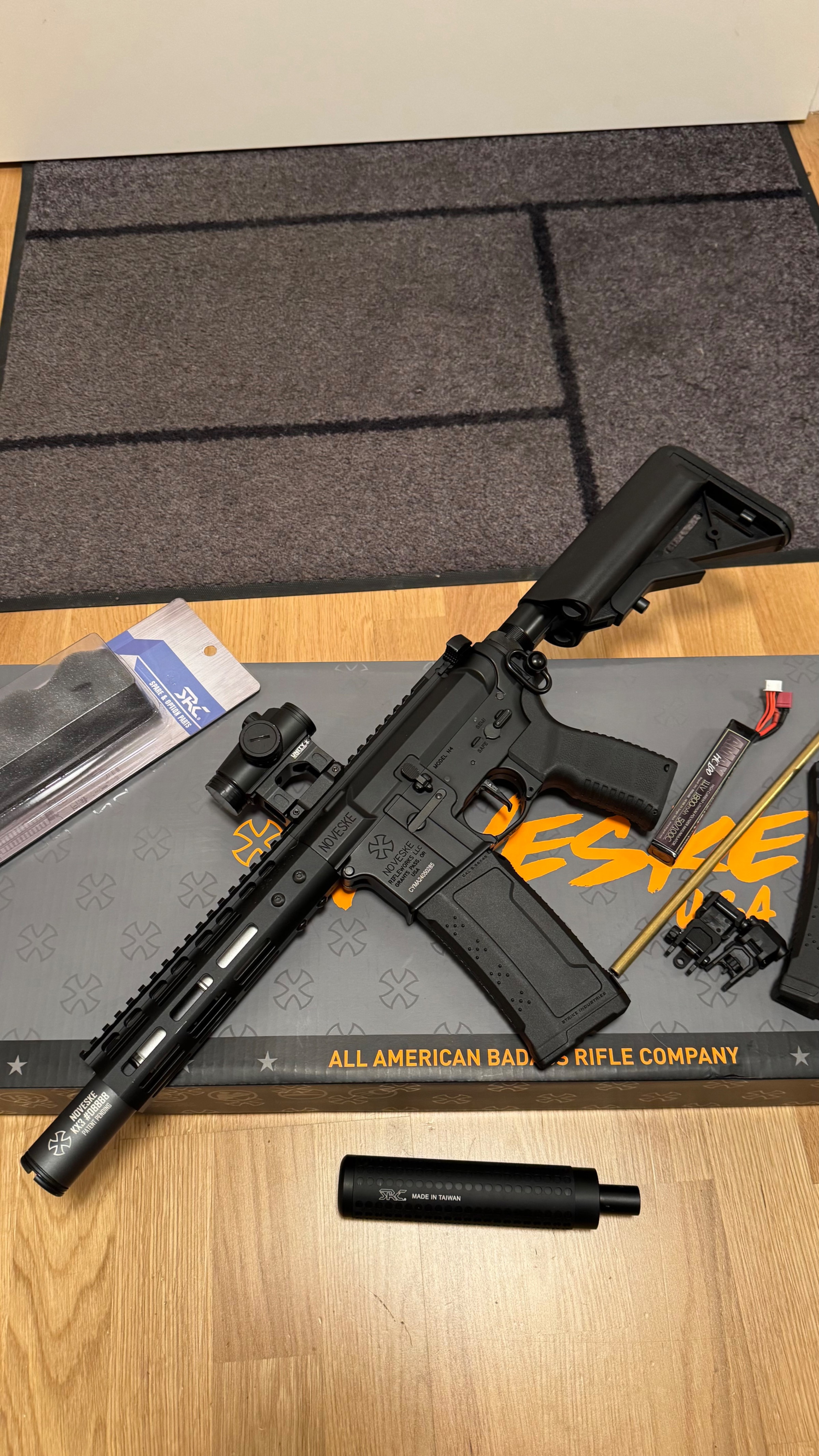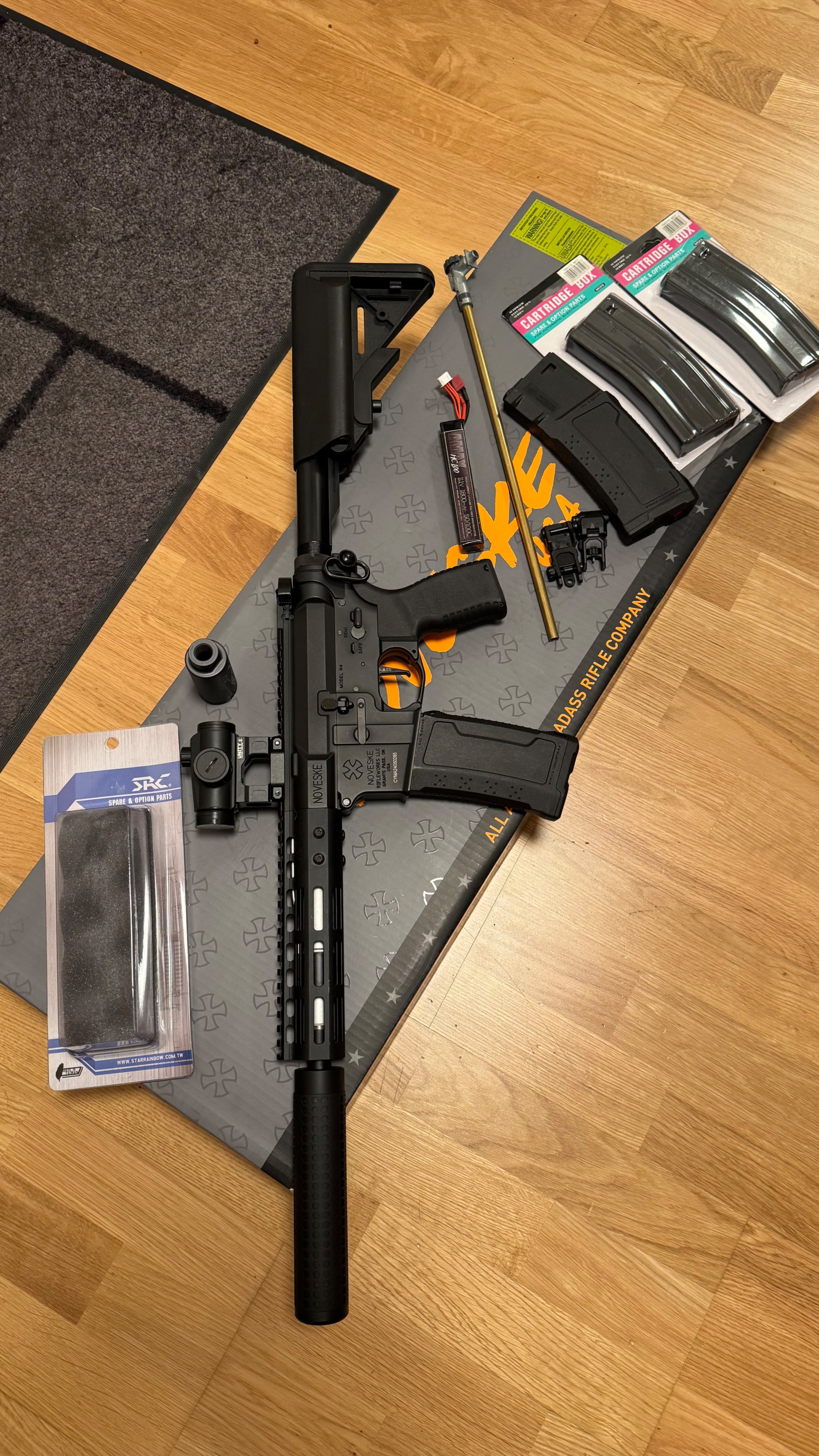 Verkaufe eine halbes Jahr alte EMG Noveske 7 Zoll AEG mit ETU, fsws, short stroke system, 1,4 joule beim letzen game gemessen mit 0,28g bbs. 2 stk Blech Magazine ( 160), 2 stk strike Industrie magazine (220) 11v lipo Akku sind dabei wie auch die Flip up sight und Schachtel. Schalldämpfer und langer innenlauf mit zweiter hopup Unit auch dabei