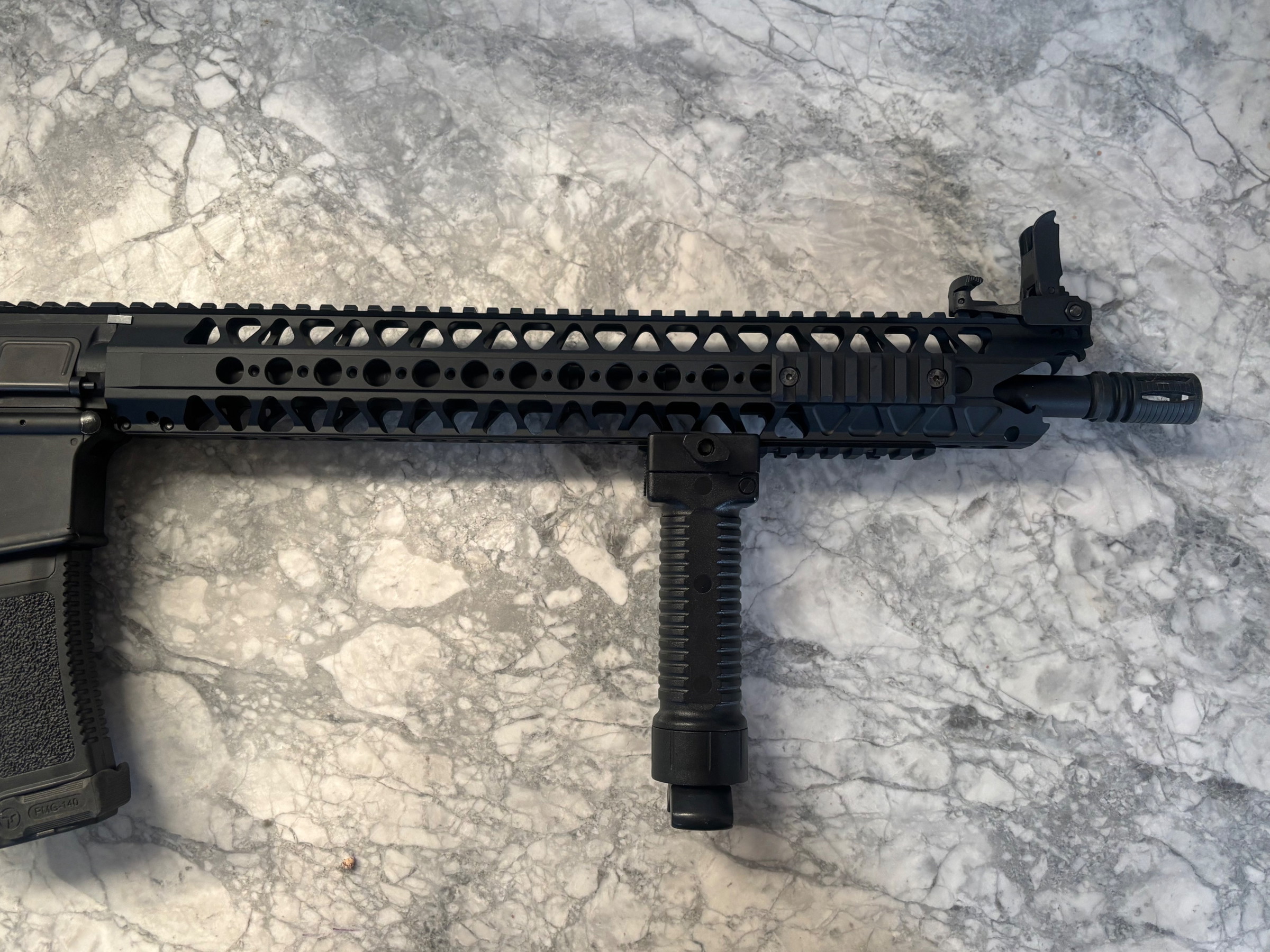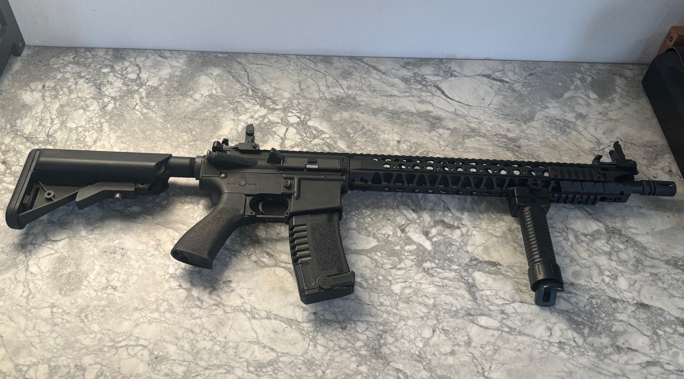 Extern is de orginele barrel en handguard vervangen voor een prachtige 16" lange LVOA stijl handguard. De ouderwetse fixed iron sights zijn vervangen voor een setje FMA foldable sights. Modernere look, en ideaal aan te passen naar eigen voorkeur.