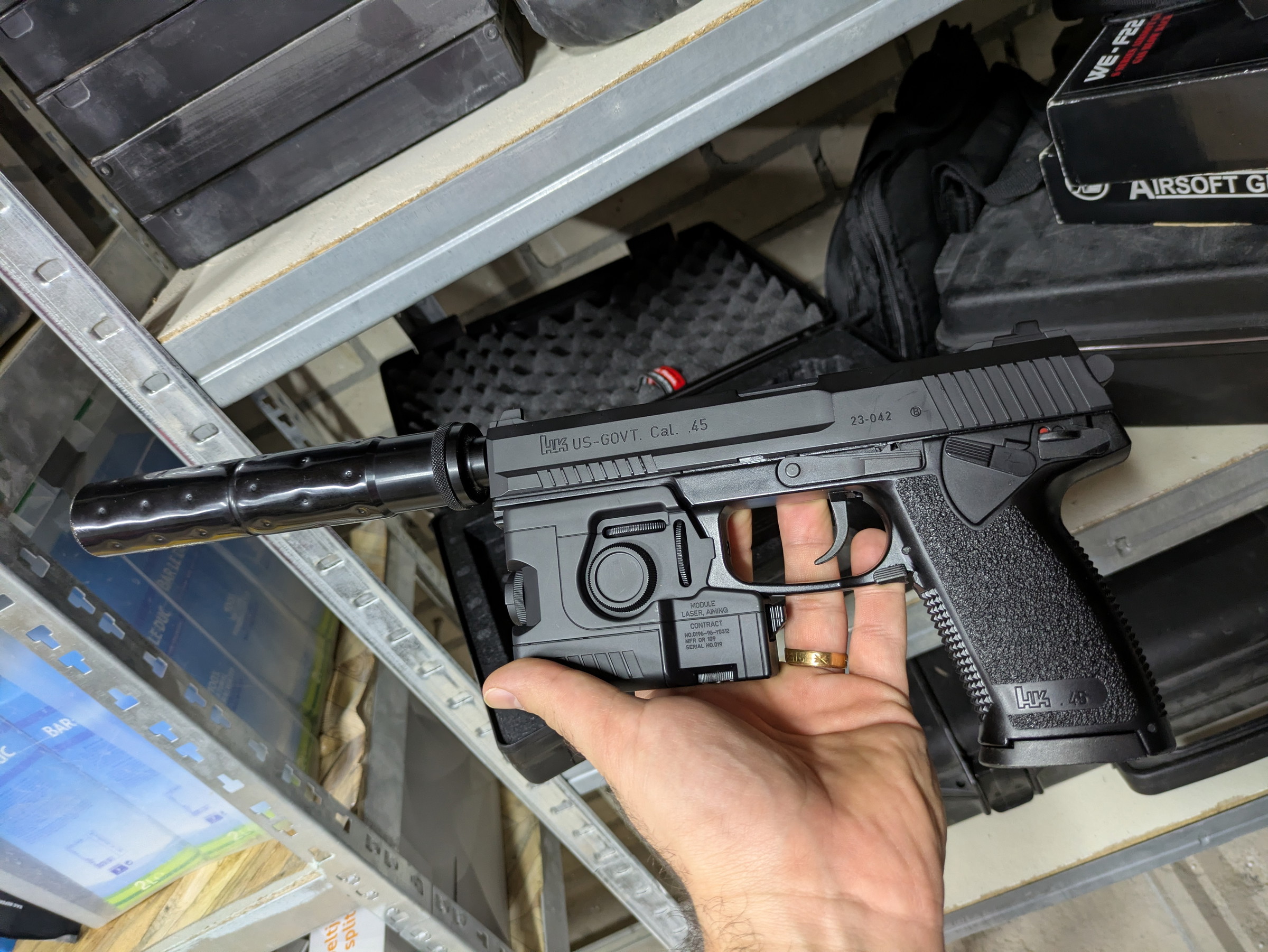 Tokyo Marui MK23 SOCOM (let op: non blowback)(met 1 lekvrij magazijn) inclusief mock suppressor, mock flashlight en koffertje.