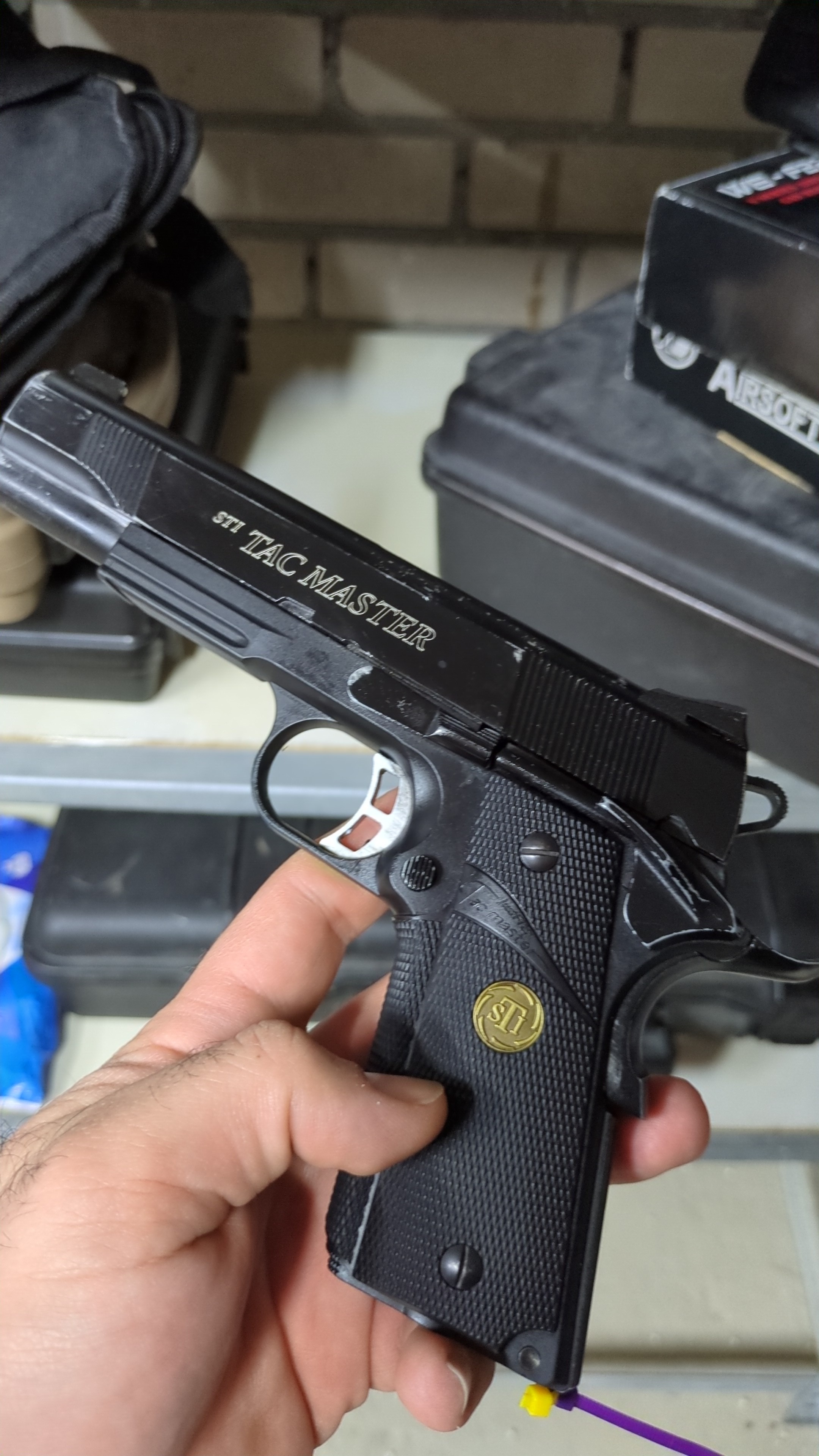 ASG 1911 tac master (met 1 lekvrij magazijn). Heeft wat liefde nodig, schiet maar de slide wil soms niet helemaal terug op positie raken.