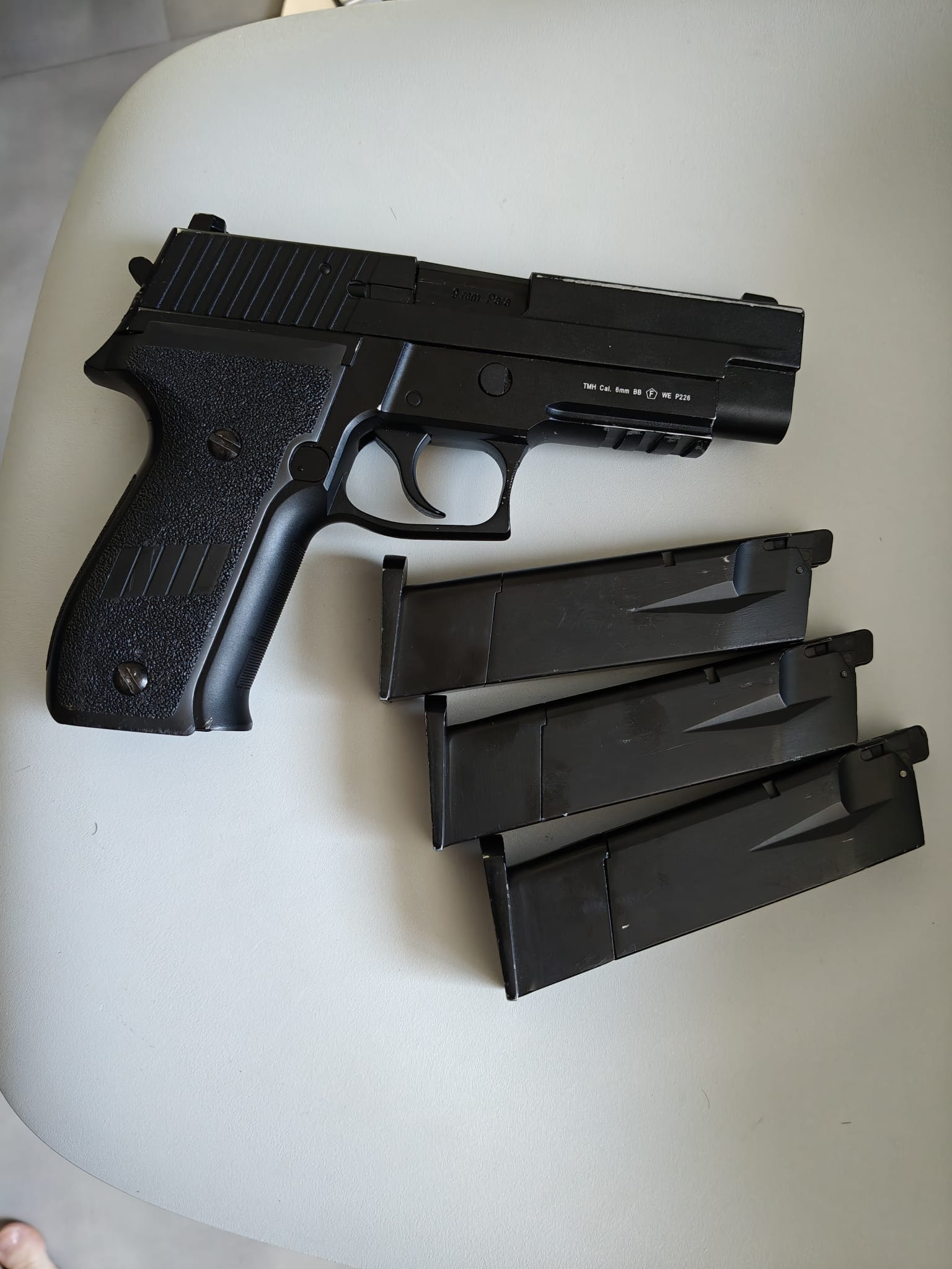 Sig Sauer P226R van WE. Met 3 lekvrije gas magazijnen. Functioneert helemaal naar behoren, wel de nodige gebruikssporen van holster en gebruik. Kleine scheur achteraan de slide zoals te zien op de foto, doet echter niks af aan de werking. Inclusief nuprol picknpluck foam case grijs.