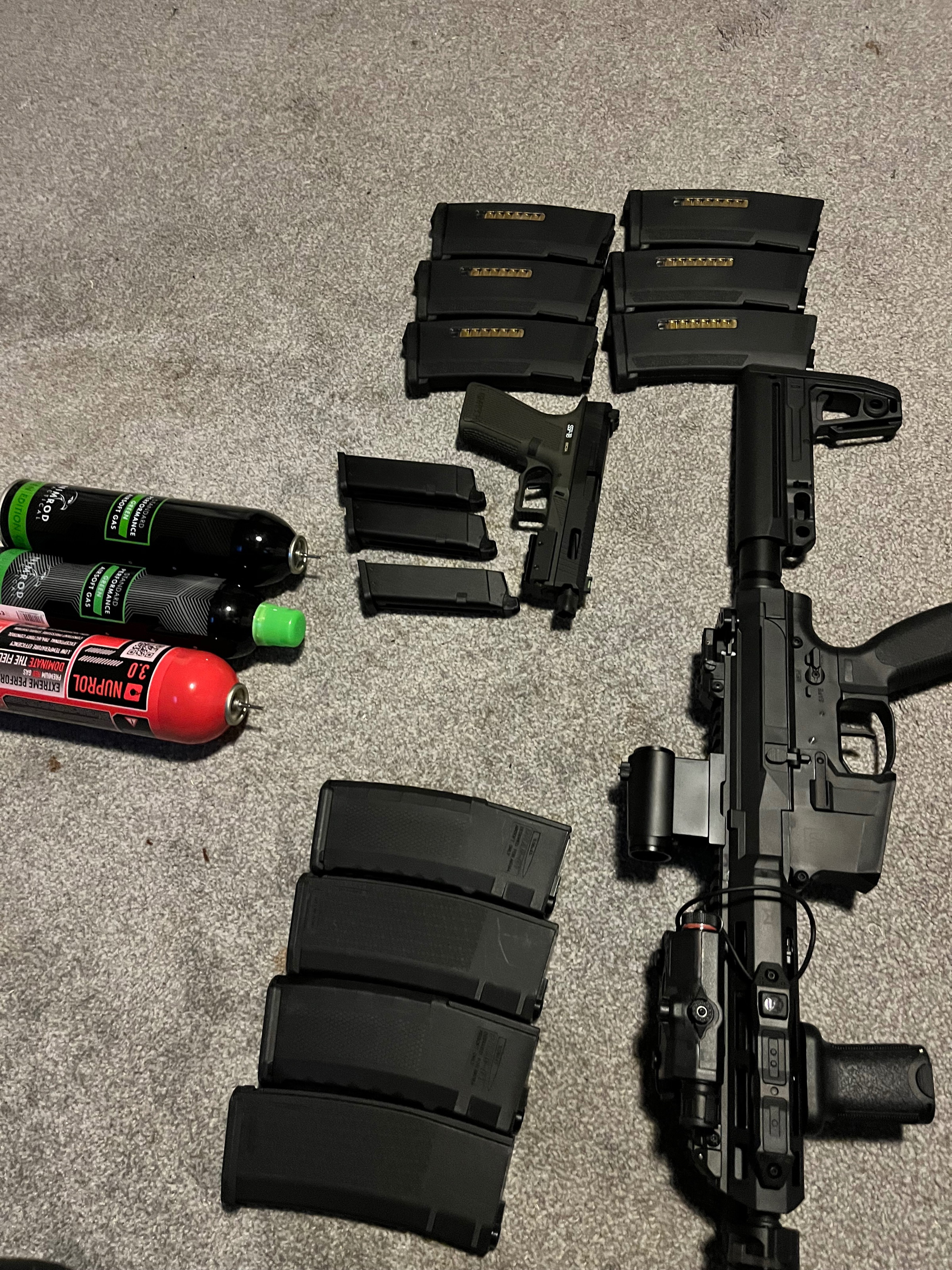 En red dot en scope zo als op de foto kan ook nog wel een sling bij alleen effe geen foto van