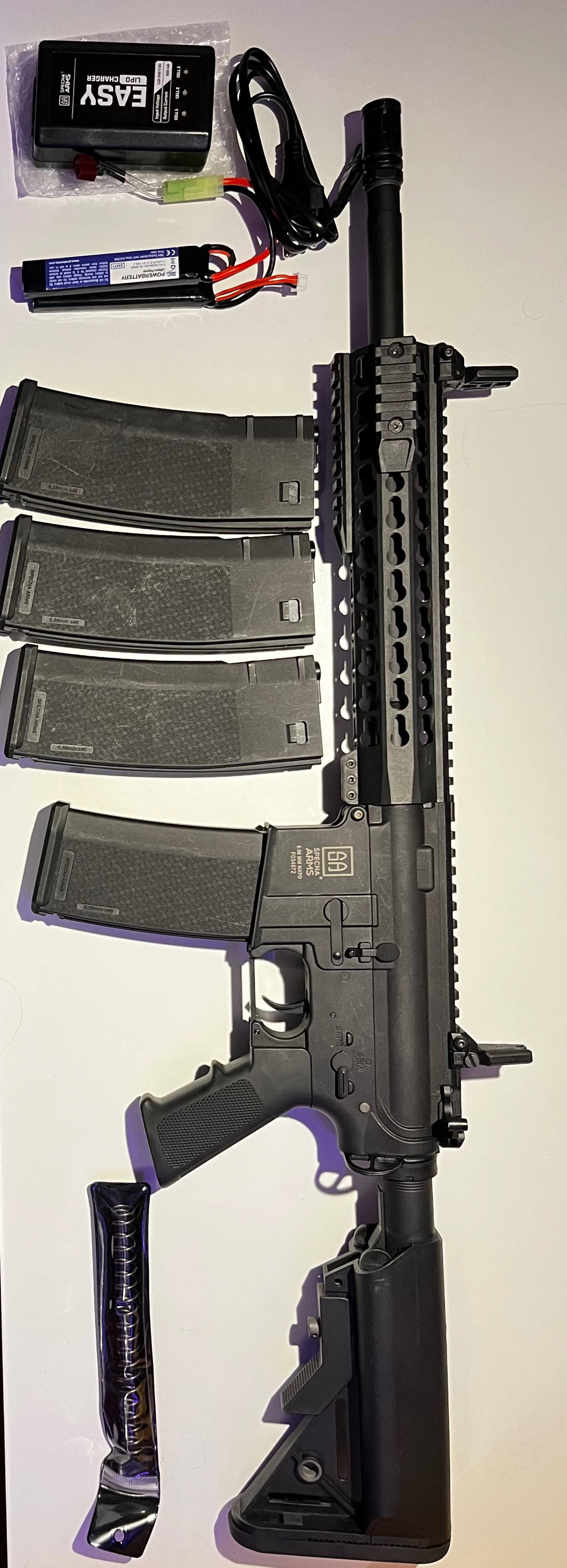 Specna Arms SA-F02 FLEX Inclusief: - Lader en 7,4V LiPo nunchuck-accu - 3 perfect werkende midcap-magazijnen en 1 kapotte highcap (voert niet) - M120-veer (er zit momenteel een M90 in) - Replica zelf natuurlijk 😁 De replica werkt perfect en ik heb er nooit problemen mee gehad. Nieuw kost hij €170 ongeveer en dan zitten de extra mags en oplader en batterij er niet bij.