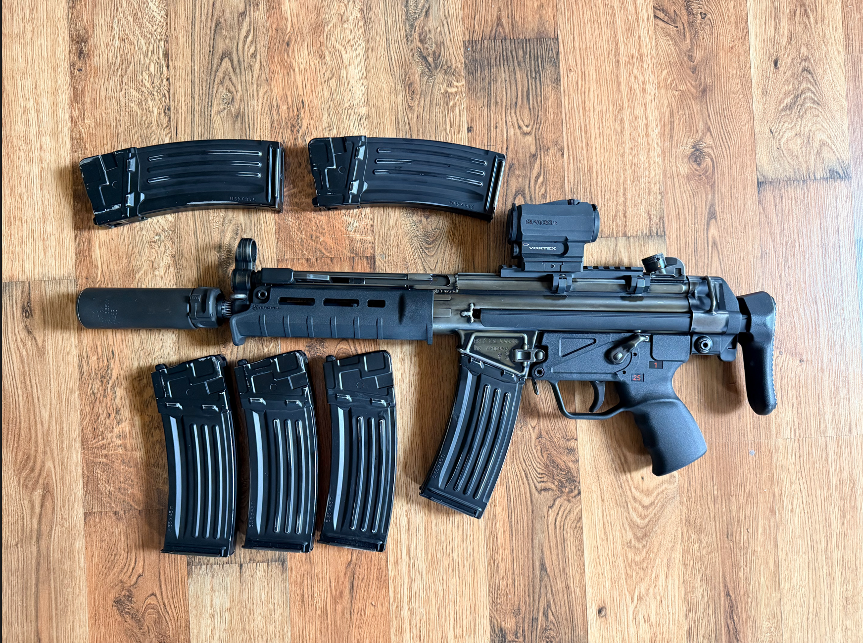 VFC/Umarex HK53 GBB – hop-up upgraded + Maple Leaf precision inner barrel, 6 mags, red dot + suppressor included