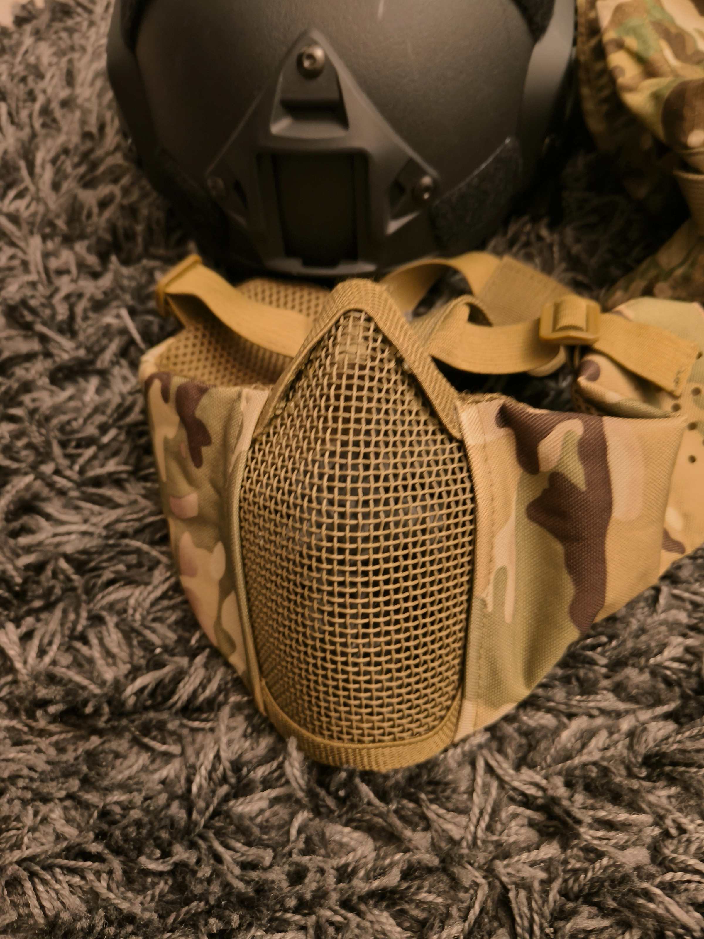 - Kleding: helm, bucket hat, mesh gezichtsmasker, carrier, gloves en broek (XL).