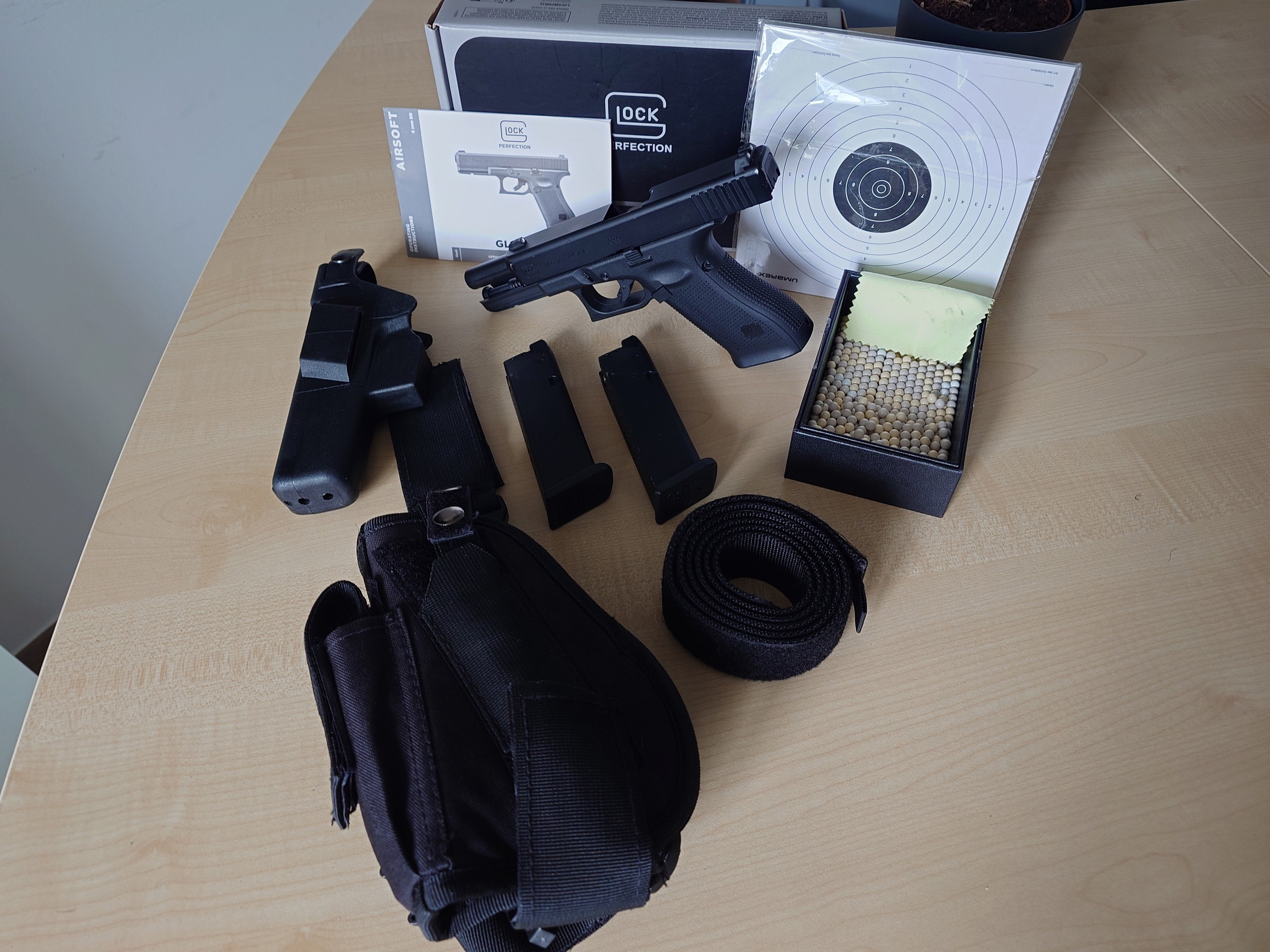 Glock 17 mit zwei Magazine, Gürtelholster rechst und Oberschenkel Holster links, Zielscheiben und 9mm Kugeln.