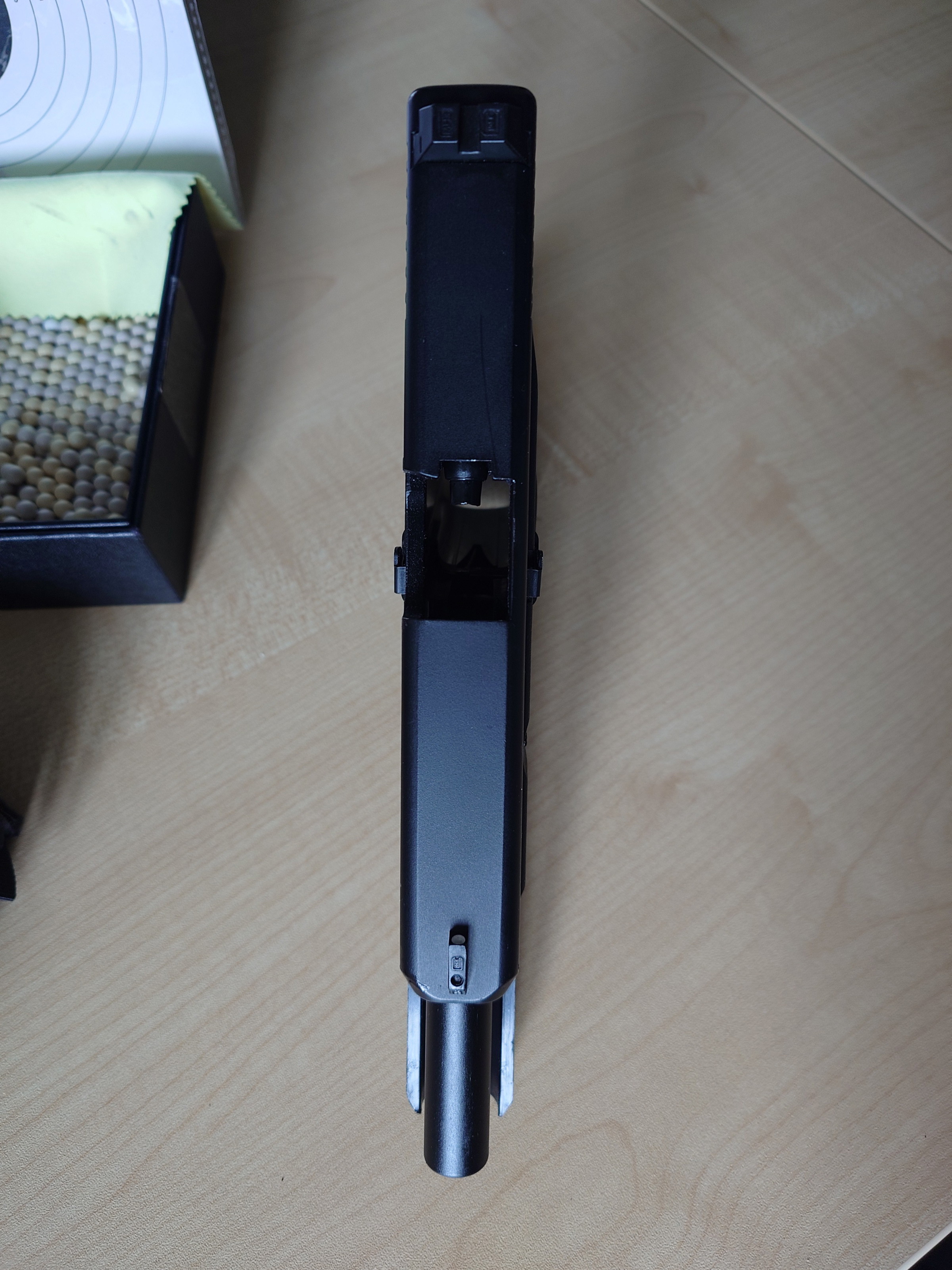 Der bei der Original Pistole beidseitig bedienbare Verschlussfanghebel wurde bei dieser Airsoftreplika zwar optisch angebracht. Ist aber leider nur auf der linken Seite bedienbar. Zum einfacheren Anvisieren sind Kimme und Korn weiß hinterlegt. Wie bereits bei der vorherigen Version ist auch bei der Generation 5 eine Picatinny-Schiene unter dem Griffstück angebracht um zusätzliche Montagemöglichkeiten zu erhalten. Für eine Verbesserung der Kugelflugbahn sorgt das vorhandene Hop-Up System. Wie beim Original sind bei der Airsoft-Version sämtliche schussrelevanten Hebel bedienbar.